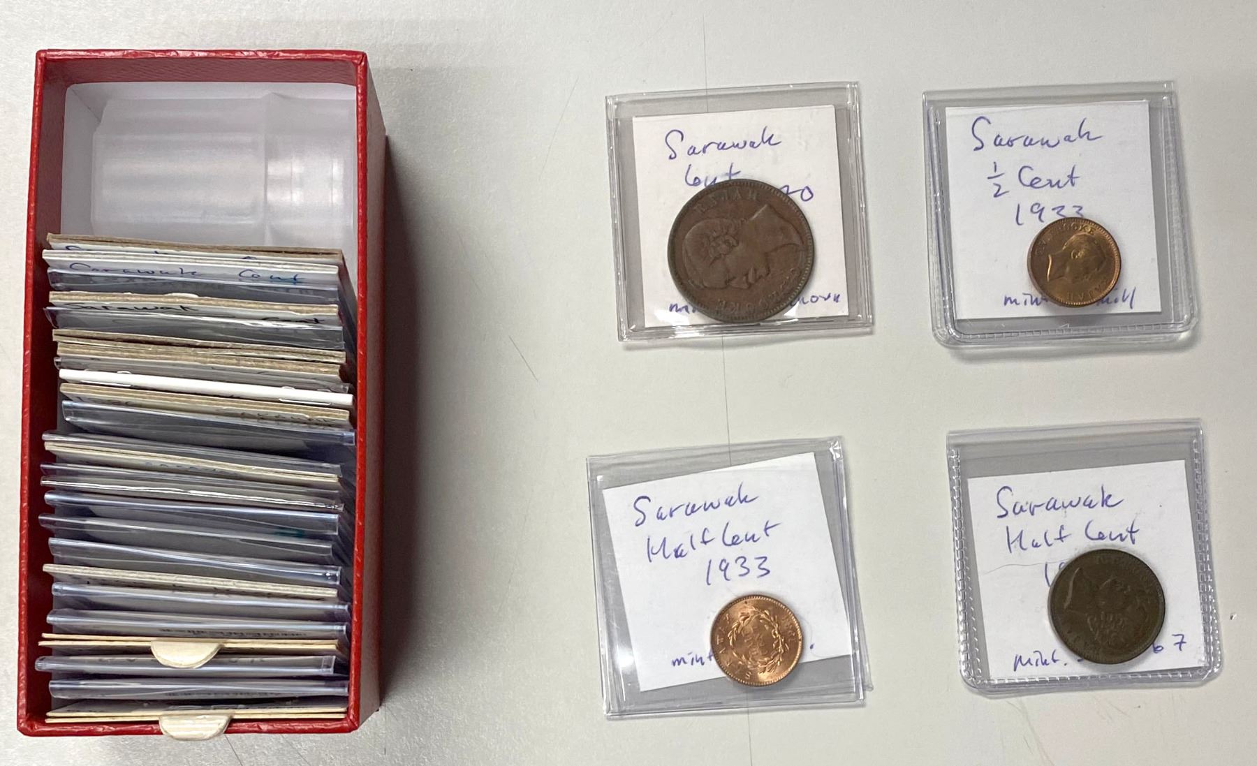 SARAWAK: LOT of 29 coins, including ¼ cent: 1863, 1870, and 1896; ½ cent: 1863, 1870 (3 pcs), 1879, 1896, and 1933-H (2); and cent: 1863, 1870, 1879 (4), 1880, 1884, 1886, 1887, 1888, 1889 (3), 1889-H (3), and 1890; average circulated grades, with some better (including 2 uncs), in consignor's 2x2 holders, viewing recommended; retail value $1000, lot of 29 pieces.