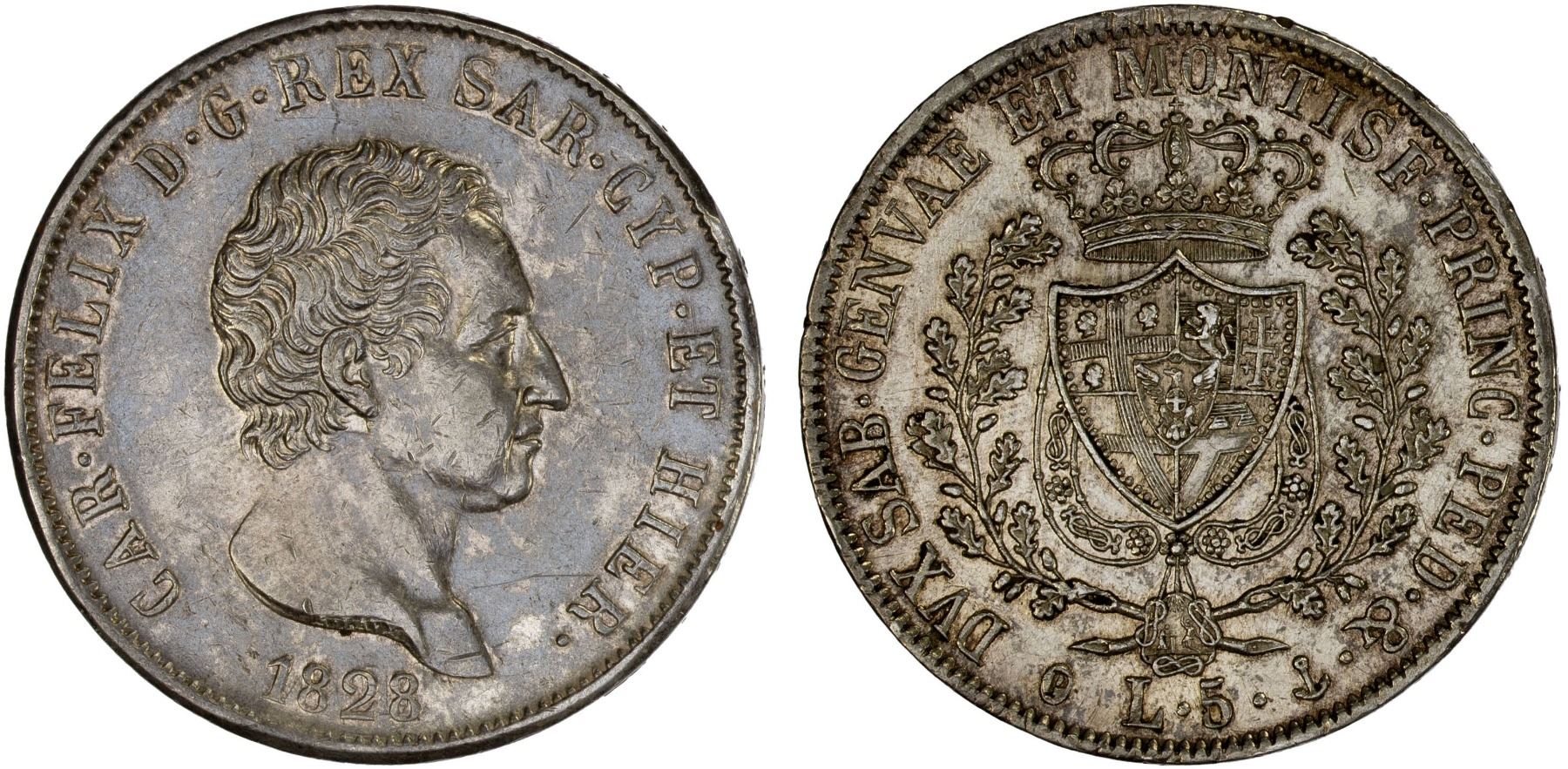 SARDINIA: Carlo Felice, 1821-1831, AR 5 lire, Genoa, 1828(b), XF