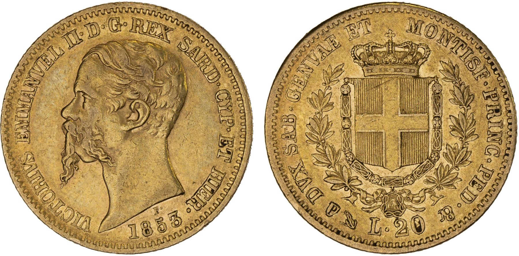 SARDINIA: Vittorio Emanuele II, 1849-1861, AV 20 lire, 1853, KM-146.2, initials F-P, bits of luster remaining, Choice VF.