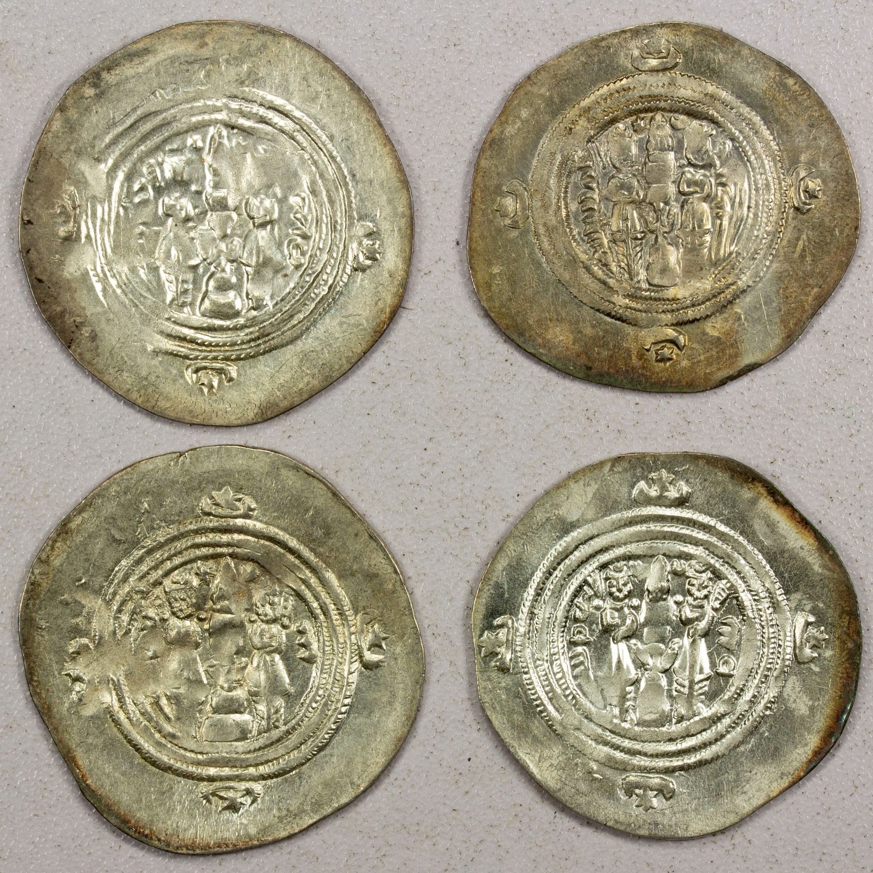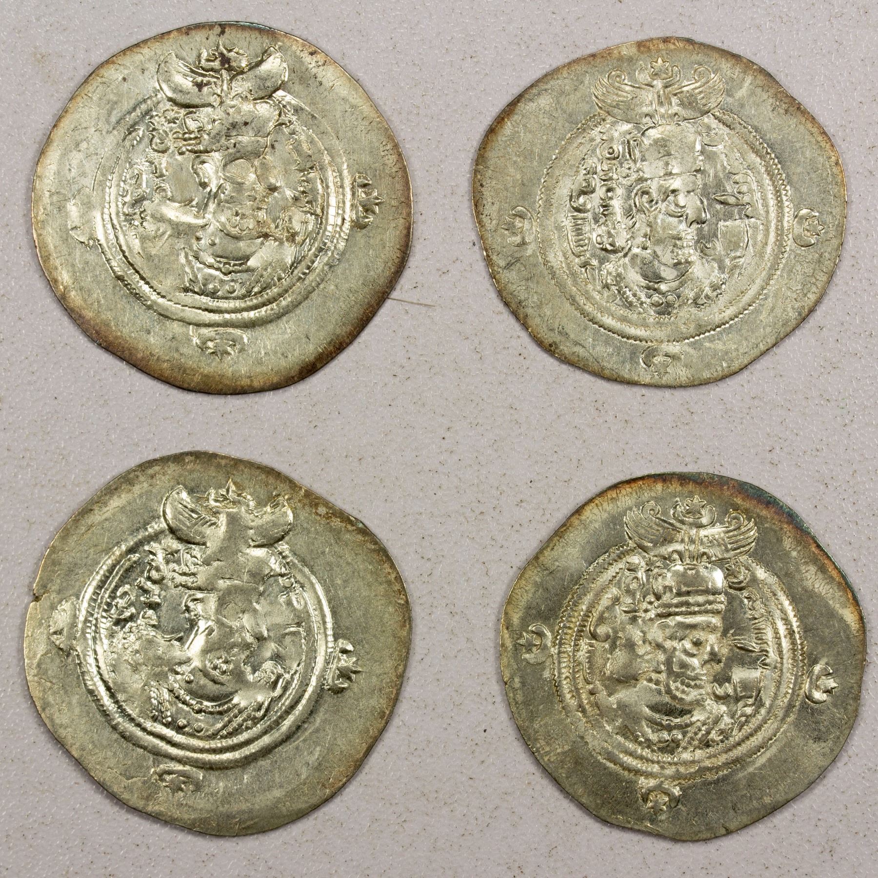 SASANIAN IMITATIVE ISSUES: LOT of 4 silver drachms, in the name of Khusro II; includes BYSh (Bishapur) year 26 (4.12g), ART (Ardashir Khurra) year 37 (4.16g), AW (Ahwaz) year 35 (4.10g), and ART (Ardashir Khurra) and year 33 (4.08g), all are in EF-AU condition; retail value $250, lot of 4 pieces. The BYSh and ART examples are struck with the save obverse die. The AW and ART examples are struck with the same obverse die. The combination of different mint names and dates with the same obverse die proves that they must have been struck elsewhere, and likely after the death of Khusro in 628. This phenomenon has been observed for several different such combinations of two different mint names and different dates with the same obverse die.