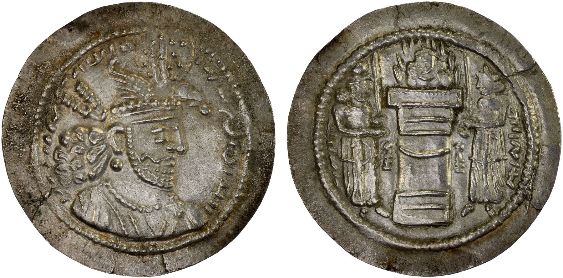 SASANIAN KINGDOM: Hormizd II, 303-309, AR drachm (4.57g), NM, G-83, king's bust right, wearing korymbos and winged eagle crown // fire altar and two attendants, bust left within flames, right attendant without korymbos, XF.