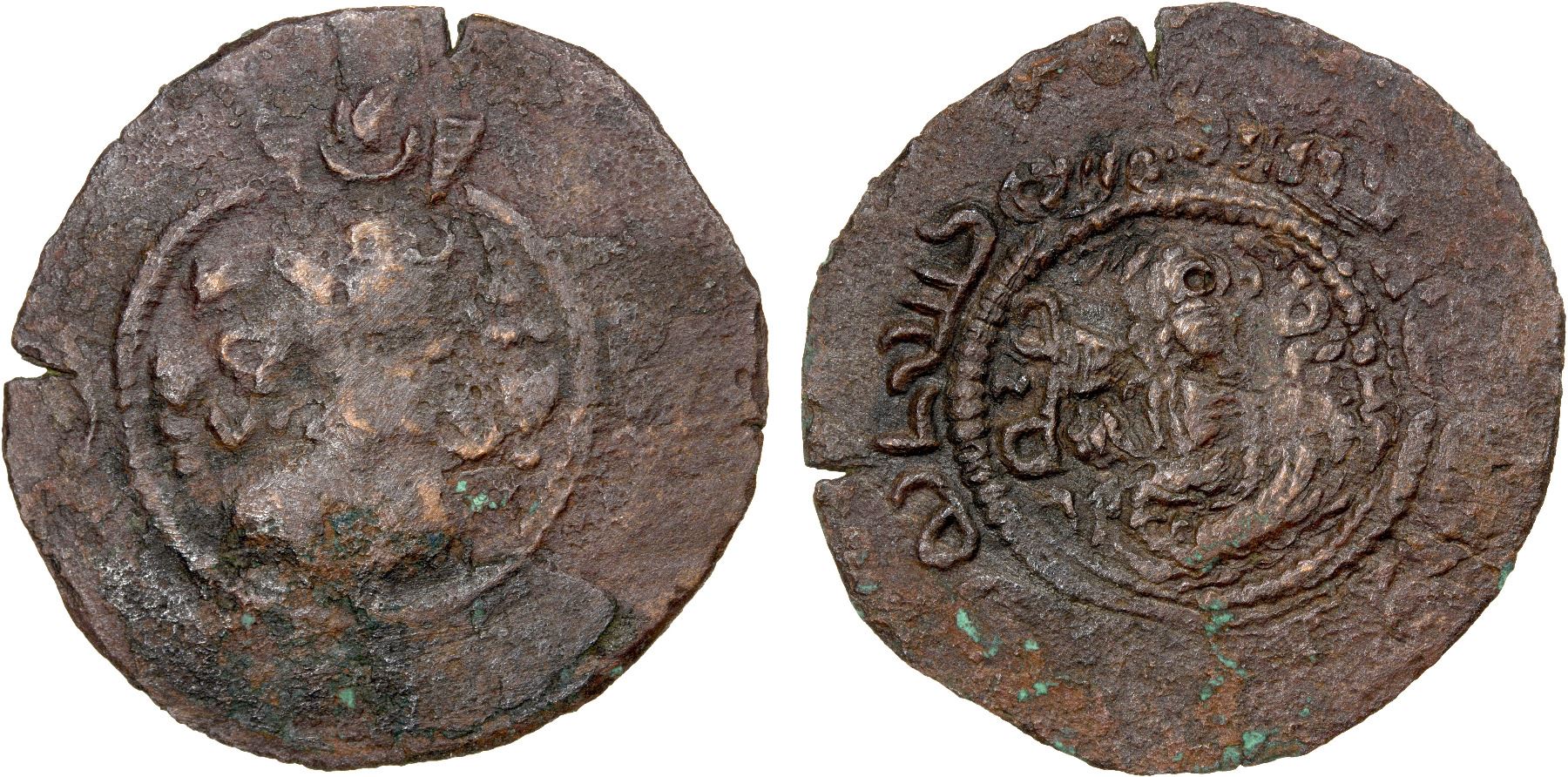 SASANIAN KINGDOM: Kavad I, 2nd reign, 499-531, AE broad pashiz (3.33g), NM, ND, G-192, cf. SNS-301/304 & A26/A29, standard obverse as on the later silver drachm of Kavad I // diademed bust right, raising right hand, blundered Pahlavi legends in both the outer margin and to the left & right of the bust, reverse partially double-struck, usual light porosity, F-VF, RRR. There are numerous varieties of this type, as illustrated in SNS and on CoinArchives, almost always different variations.