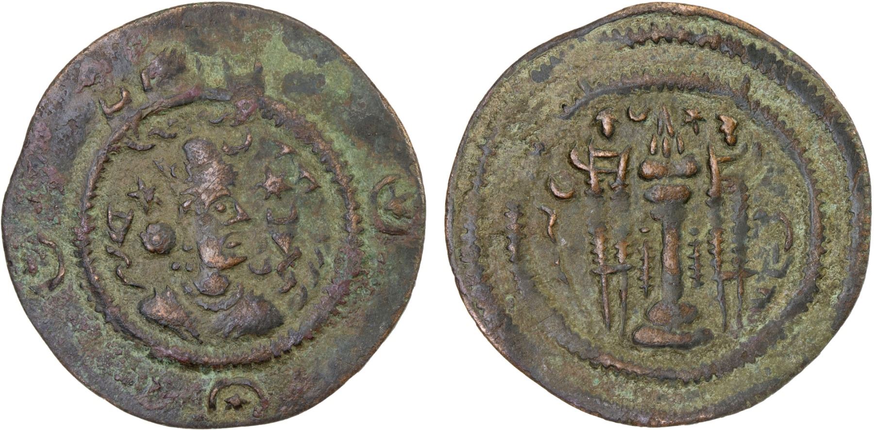 SASANIAN KINGDOM: Kavad I, 488-497, 499-531, AE "drachm" (3.44g), cf. SNS-311, copper local issue derived from his 4th type (Göbl-189), blundered mint & date, VF.