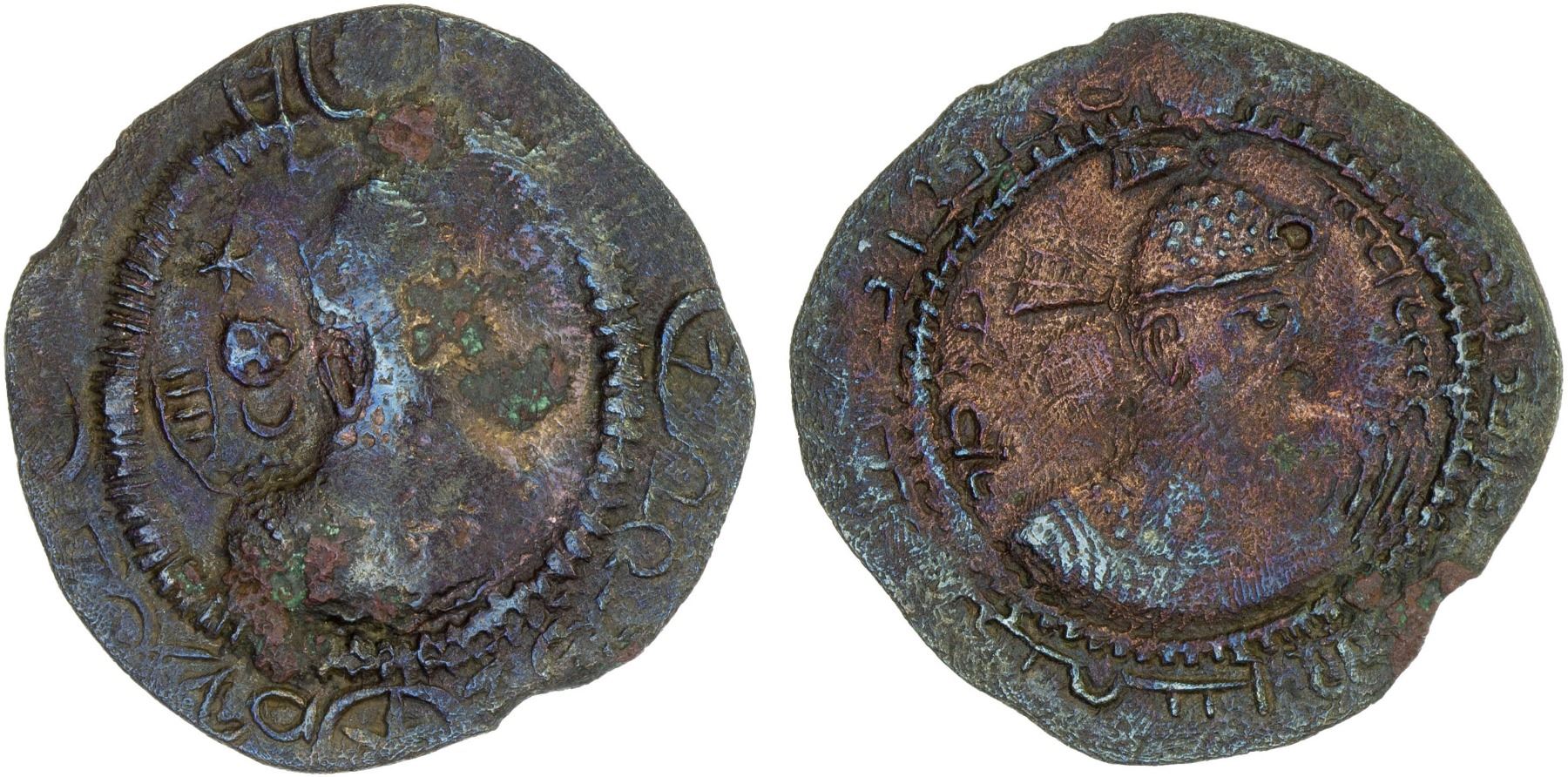 SASANIAN KINGDOM: Kavad I, 488-497, 499-531, AE unit (3.72g), NM, G-192, standard bust of Kavad I // unusual capped bust with korymbos and ribbons, blundered legend around, F-VF, RR.