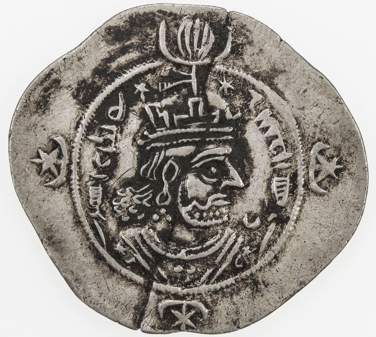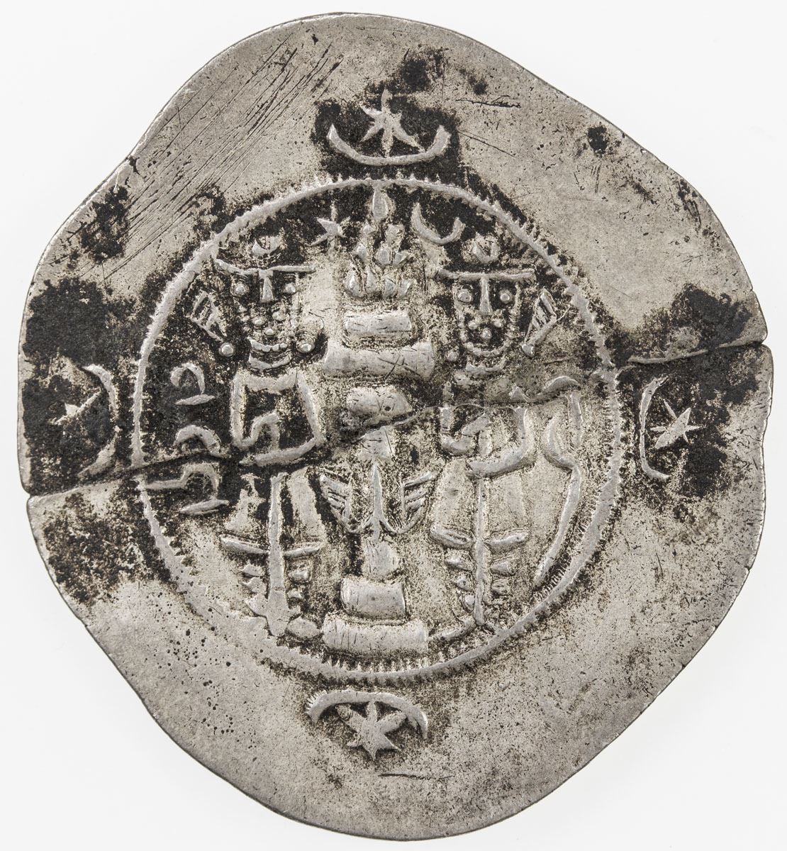 SASANIAN KINGDOM: Kavad II, 628, AR drachm (4.03g), YZ (Yazd), year 2, G-223, Pahlavi PYLWC ("victory") behind the king's bust on the obverse, broken in two and repaired, VF-EF, R.