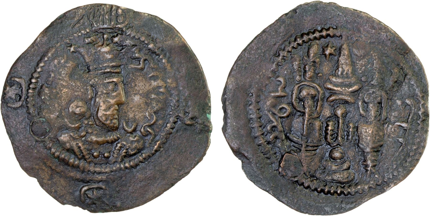 SASANIAN KINGDOM: Khusro, AE "dirham" (2.80g), LA, year 5, clearly a contemporary or slightly later imitation, based on type Göbl-209 of Khusro II, but with very weak wings on the king's crown; probably a local issue of one of the Hunnic tribes, crude VF, RR. The mint & date are surprisingly well engraved, which would have been the Khusro II issue of his year 5 (595).
