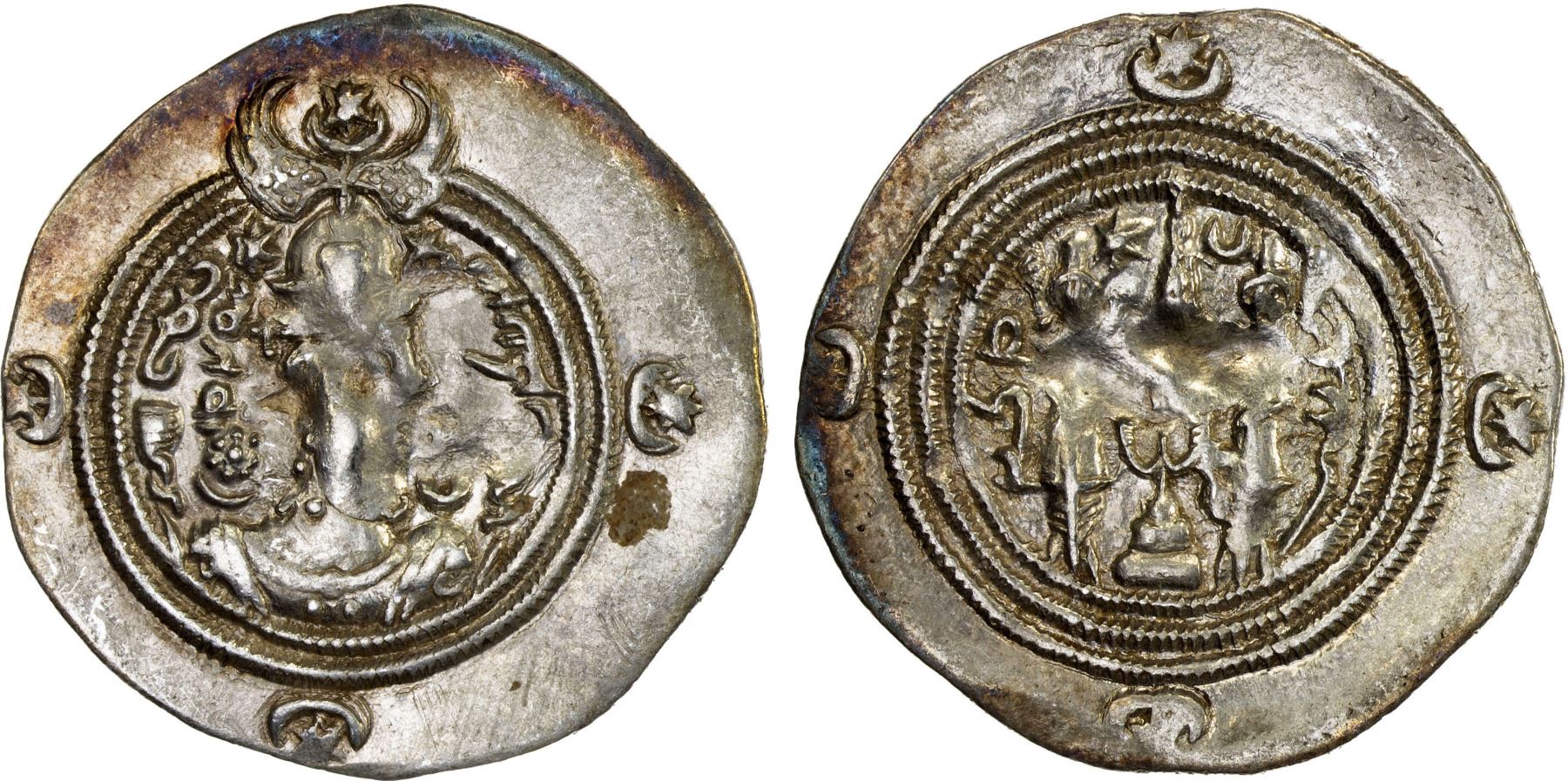 SASANIAN KINGDOM: Khusro II, 591-628, AR drachm, WYH (Bihqubadh), year 2, G-209, decent portrait, wings filled with pellets rather than crisscross lines, XF, R. Bihqubâdh is taken from the Persian meaning "the good land of king Qubâdh".