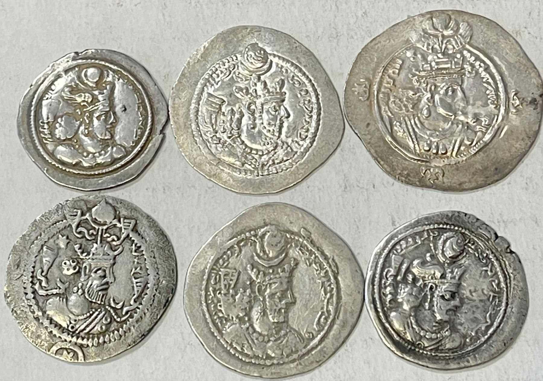SASANIAN KINGDOM: LOT of 6 pleasing silver drachms: Varahran IV (G-141, AS mint, VF); Varahran IV (G-136, BB mint, VF); Varhran V (G-155, AH mint, VF); Yazdigerd II (G-160, MY mint, EF); Kavad I (G-185, GW mint, year 14, VF, some border damage on reverse); and Ardashir III (G-226, AYLAN mint, EF); retail value $450, lot of 6 pieces.