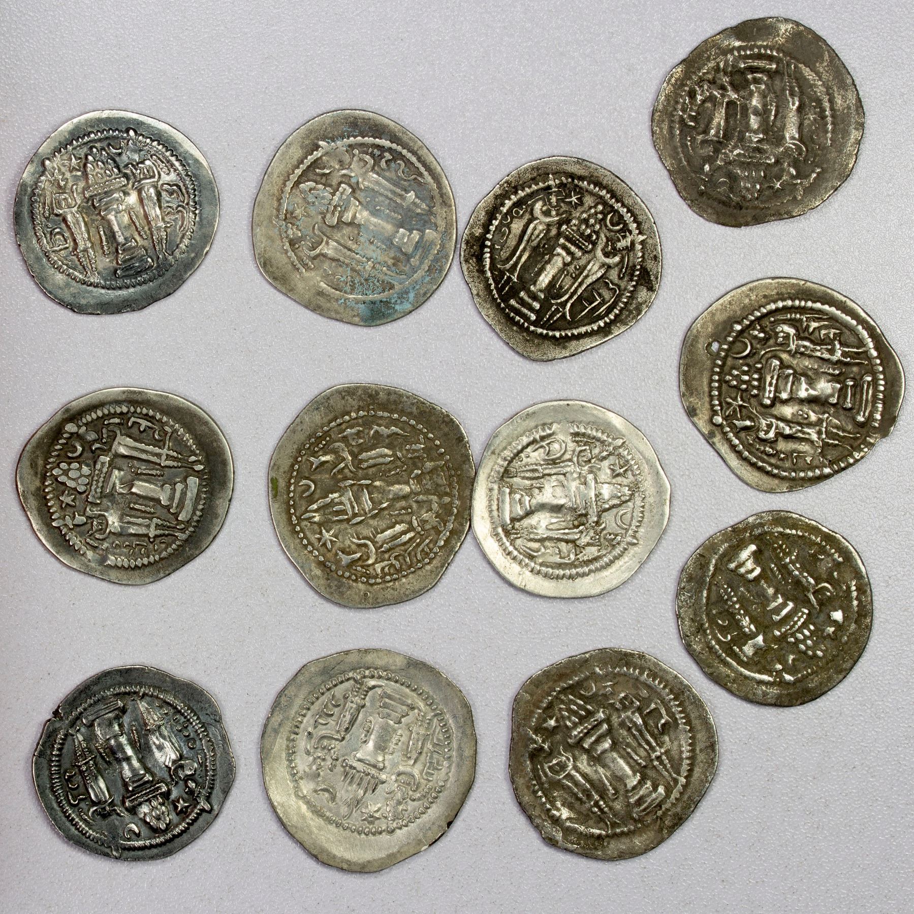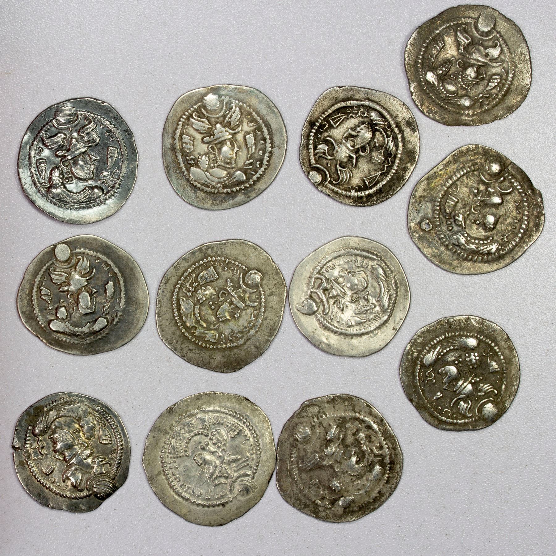 SASANIAN KINGDOM: Peroz, 457-484, LOT of 12 silver drachms, G-177, including the mints of AS, AT, AY, DA, GW, LD, LYW, and WA, all in VF condition, a couple slightly nicer; retail value $550, lot of 12 pieces.
