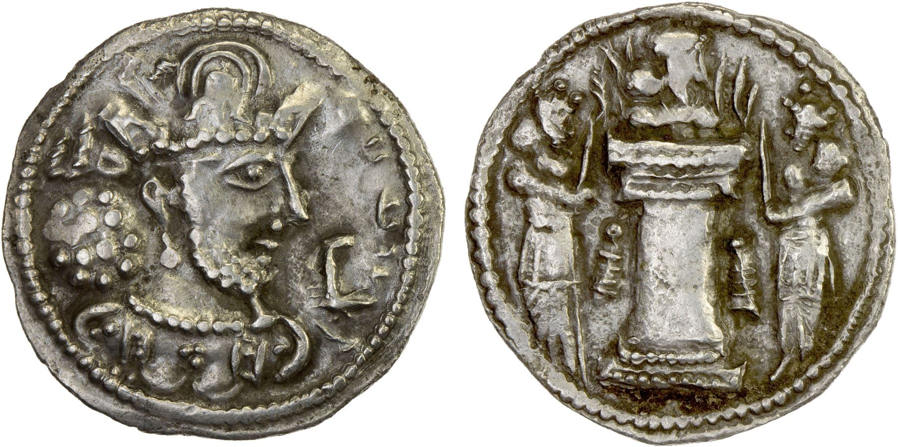 SASANIAN KINGDOM: Shahpur II, 309-379, AR drach (3.29g), G-102, special issue with an additional character before the king's bust on the obverse, bold VF, RR.