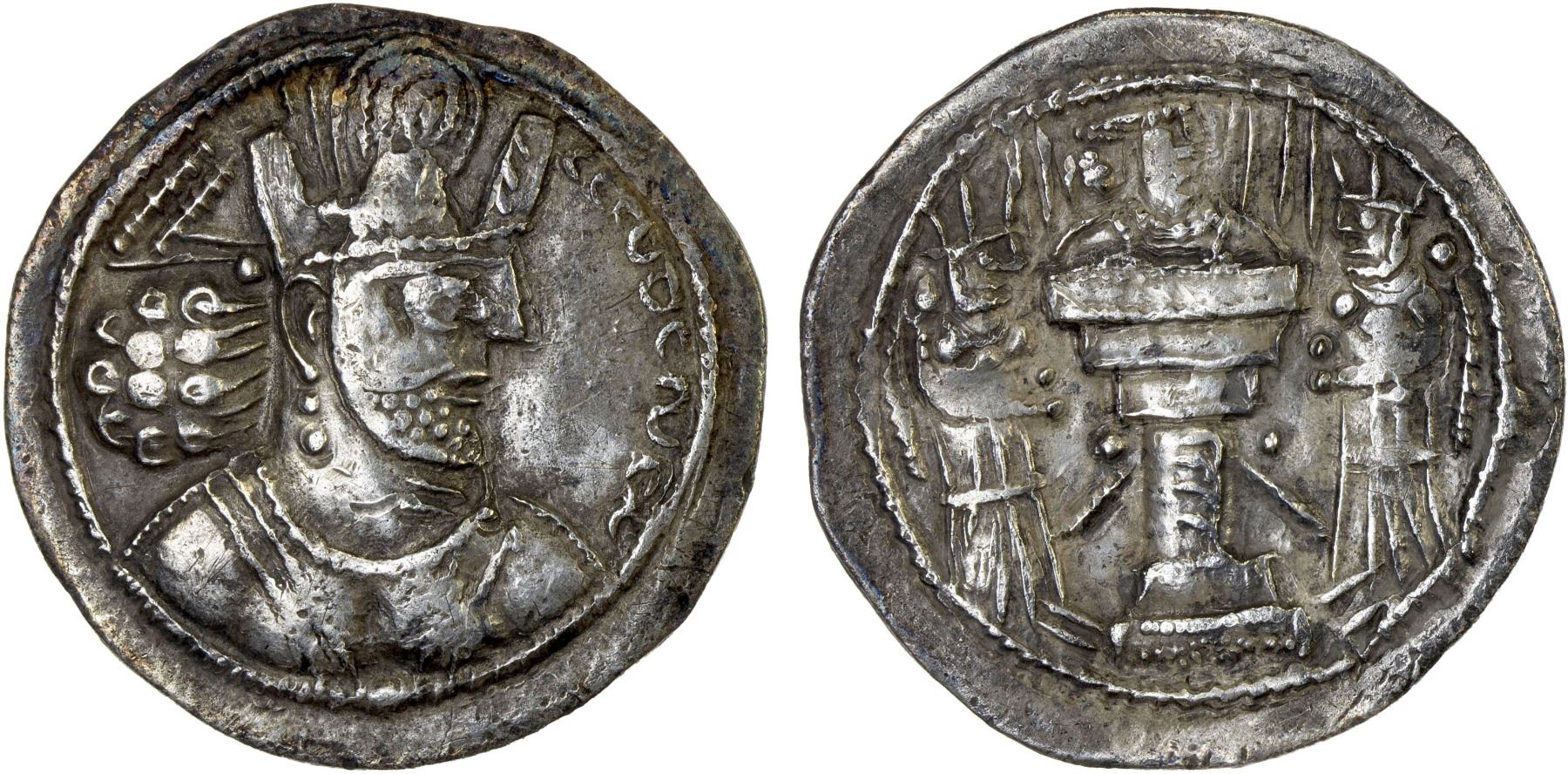 SASANIAN KINGDOM: Shahpur II, 309-379, AR drachm (4.19g), G-102, head in fire, eastern style, late issue, nice strike, strong VF.