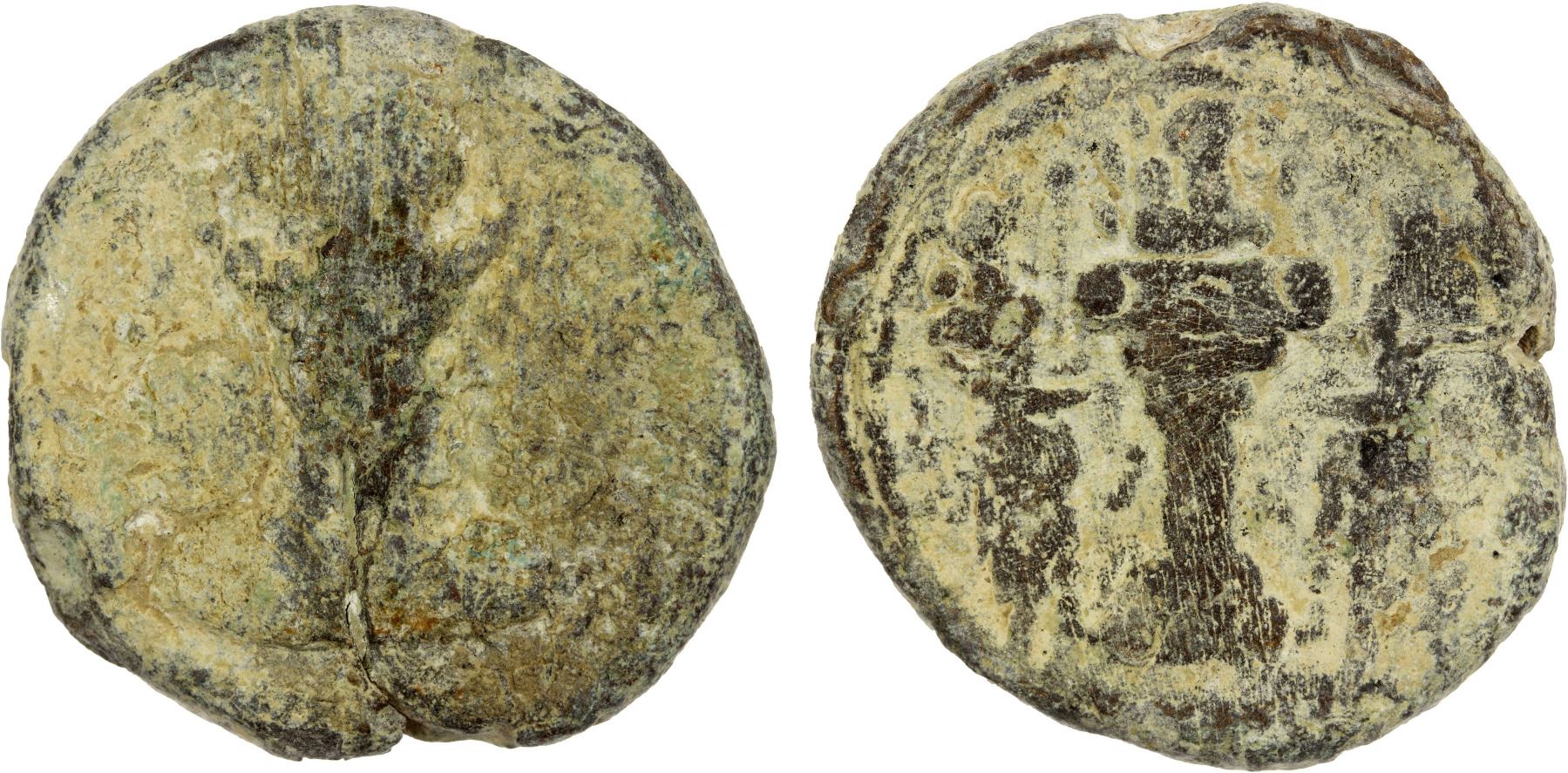 SASANIAN KINGDOM: Shahpur II, 309-379, heavy lead unit (15.62g), G-, king's bust right, crescent and annulet to right // fire altar & two attendants, style of the silver drachm type G-105; the heaviest example we have seen and very rare in lead at any weight, Fine, RRR.