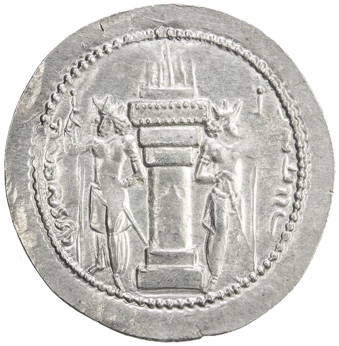 SASANIAN KINGDOM: Shahpur (Sabuhr) I, 241-272, AR drachm (4.41g), G-23, king's bust, wearing tiara headdress with korymbos & earflaps // fire altar guarded by two assistants, EF.