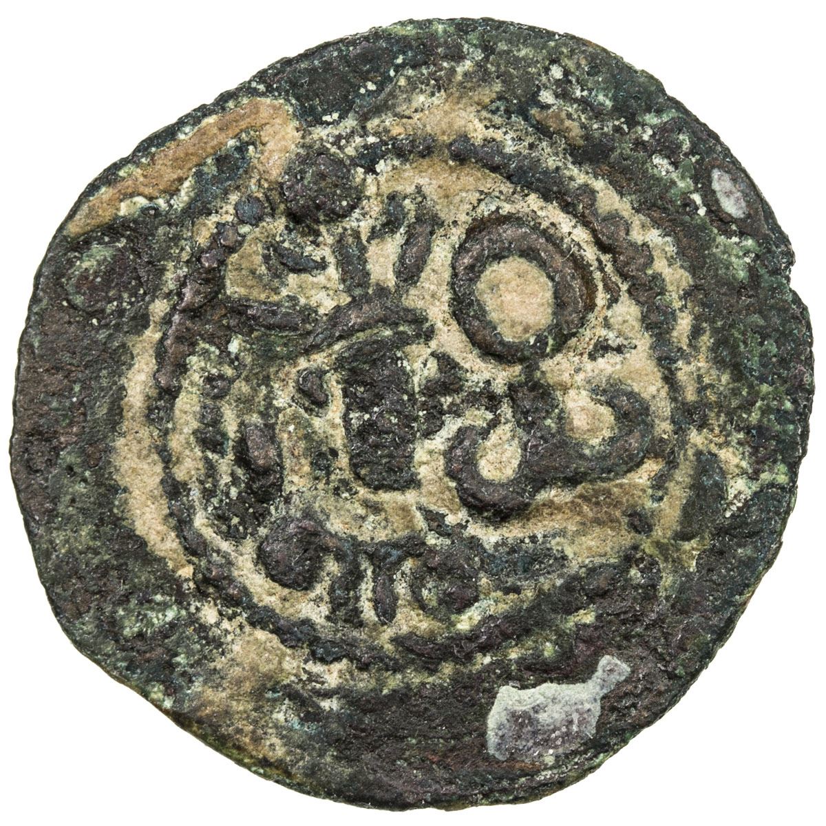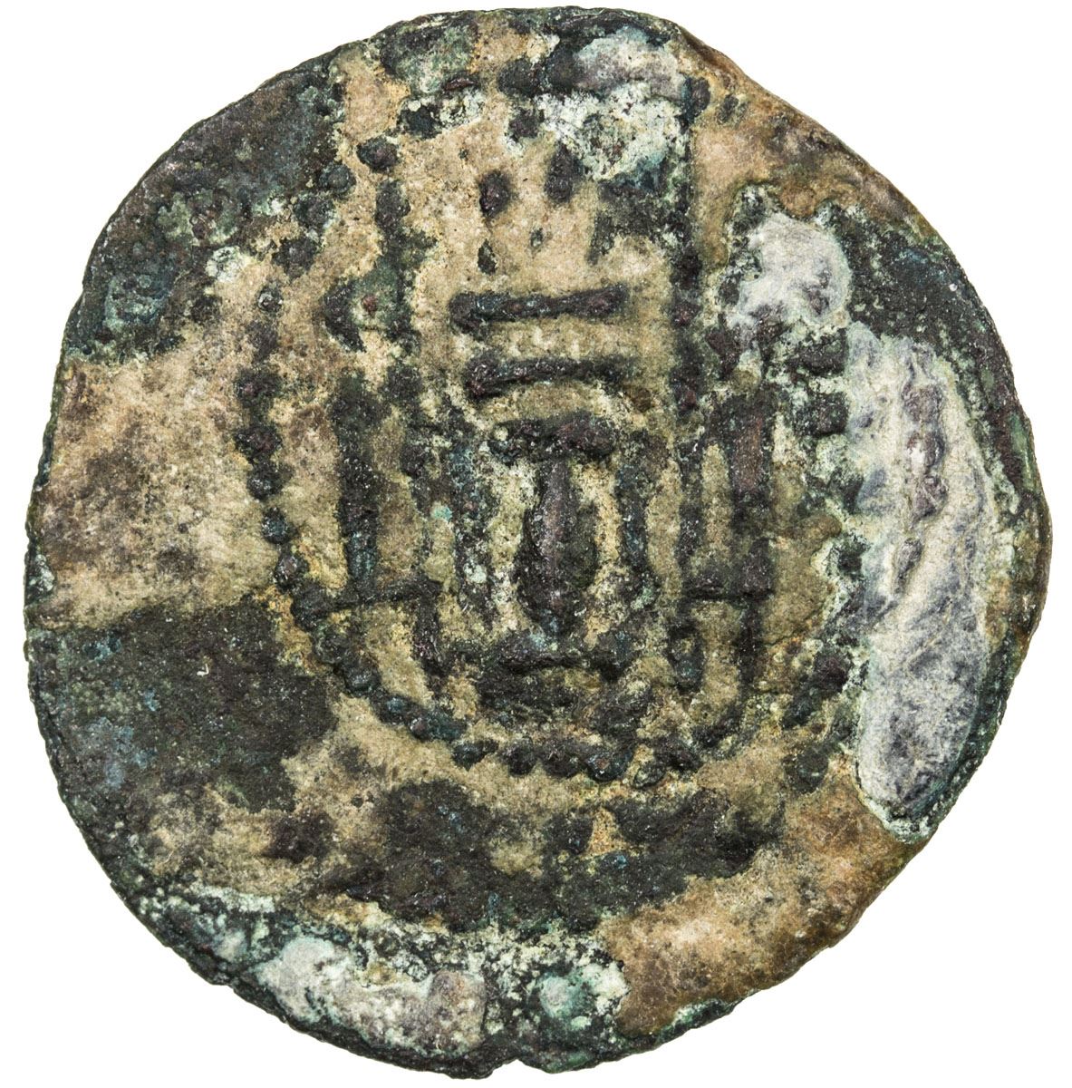 SASANIAN KINGDOM: Yazdigerd II, 438-457, AE pashiz (1.13g), G-166, SNS-A37, king 's bust right, tamgha with large annulet at the top, to the right // fire altar & two attendants, some discoloration, F-VF, RR, ex Clive Foss Collection.