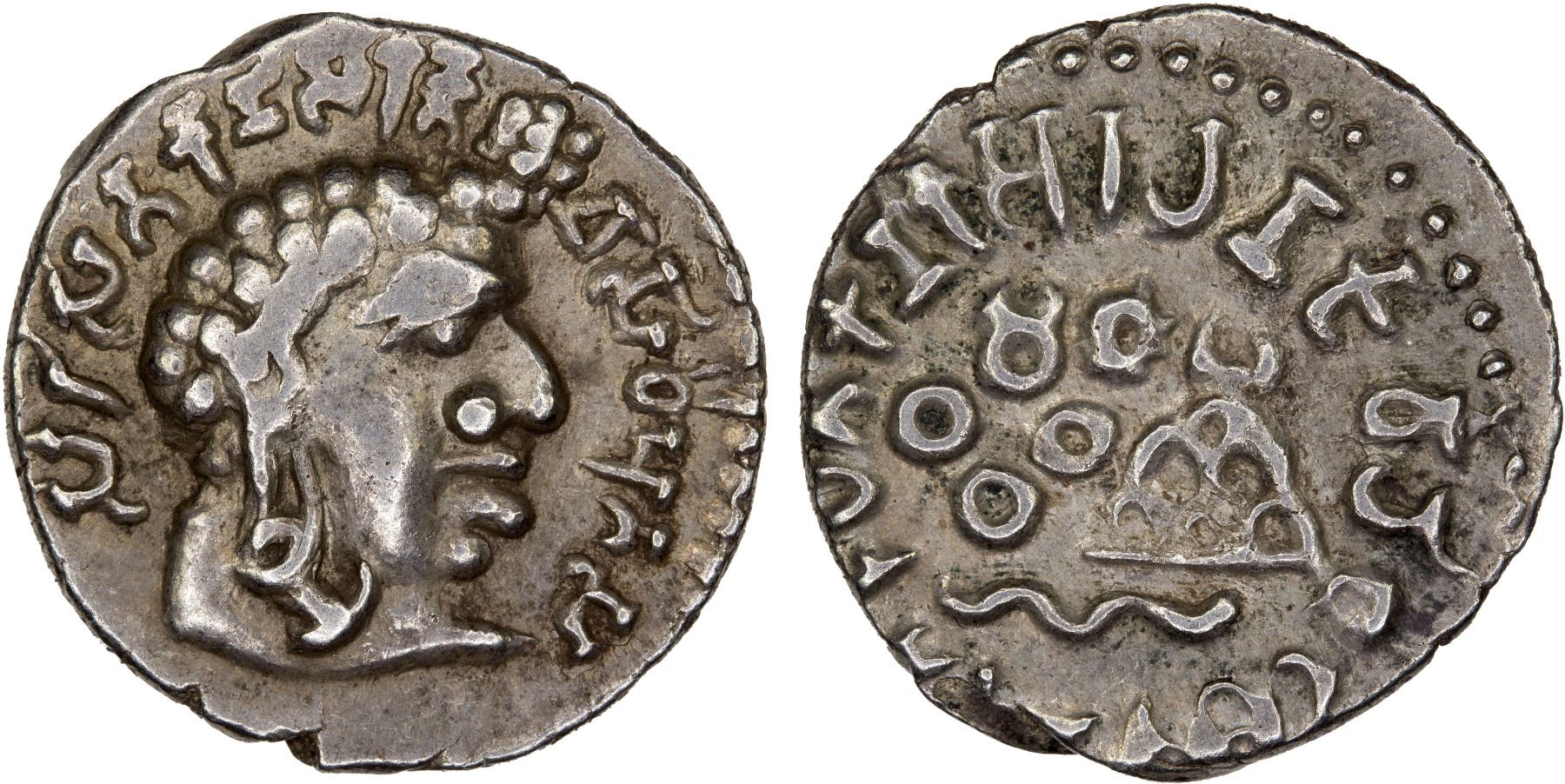 SATAVAHANA: Vasishthiputra Sri Satakarni, ca. 125-152, AR drachm (2.31g), Pieper-2752 (this piece), bust right, Brahmi legend rajno vasithiputasa siri satakarnisa // hill right and Ujjain symbol left, river line below, Tamil legend around; lovely portrait, XF, RR, ex Wilfried Pieper Collection. Remarkable portrait style with strikingly prominent far advanced lower lip.