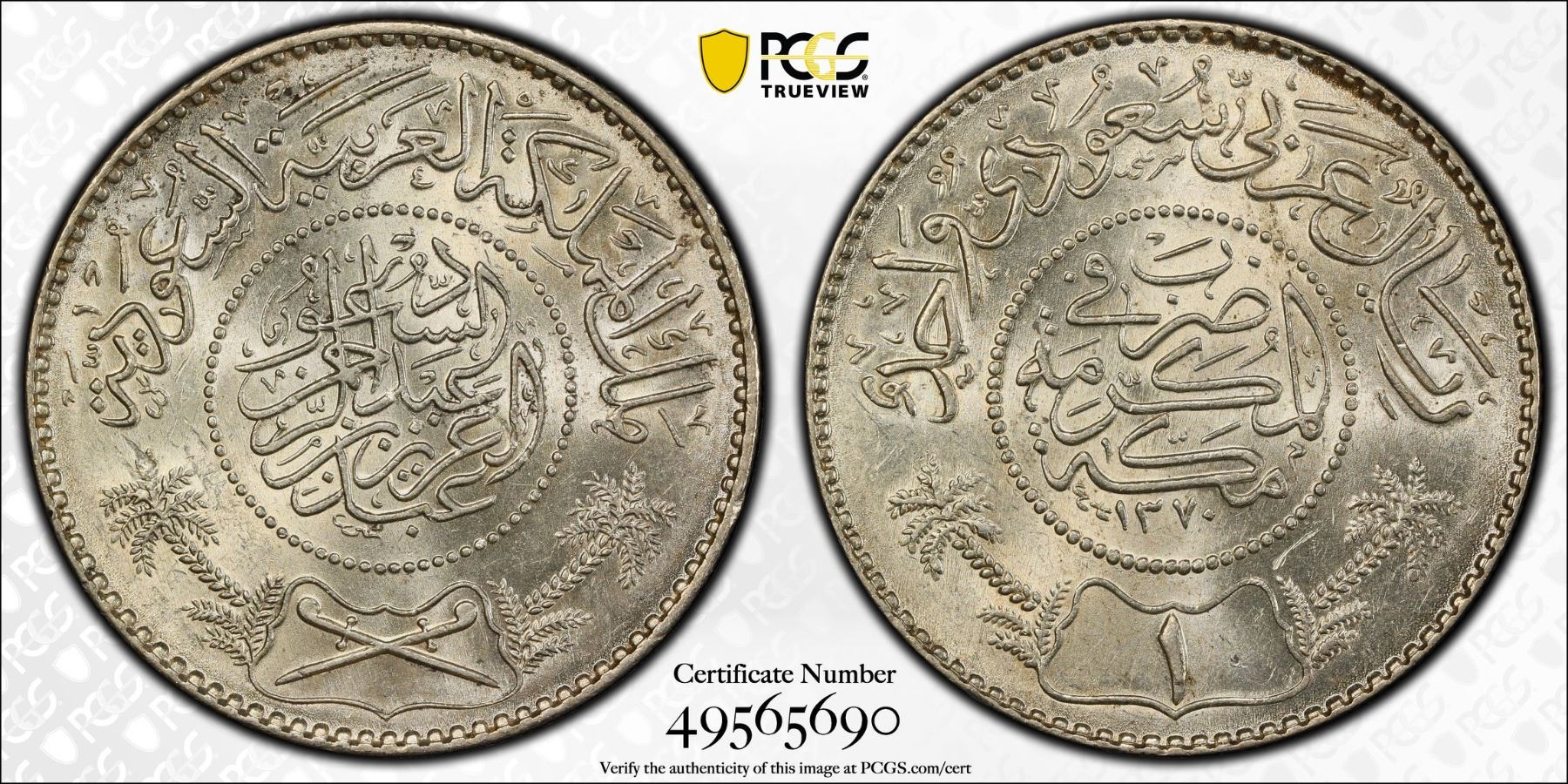 SAUDI ARABIA: 'Abd al-'Aziz b. Sa'ud, 1926-1953, AR riyal, Makka al-Mukarrama (Mecca), AH1370 (1950), KM-18, a wonderful quality example! PCGS graded MS64
