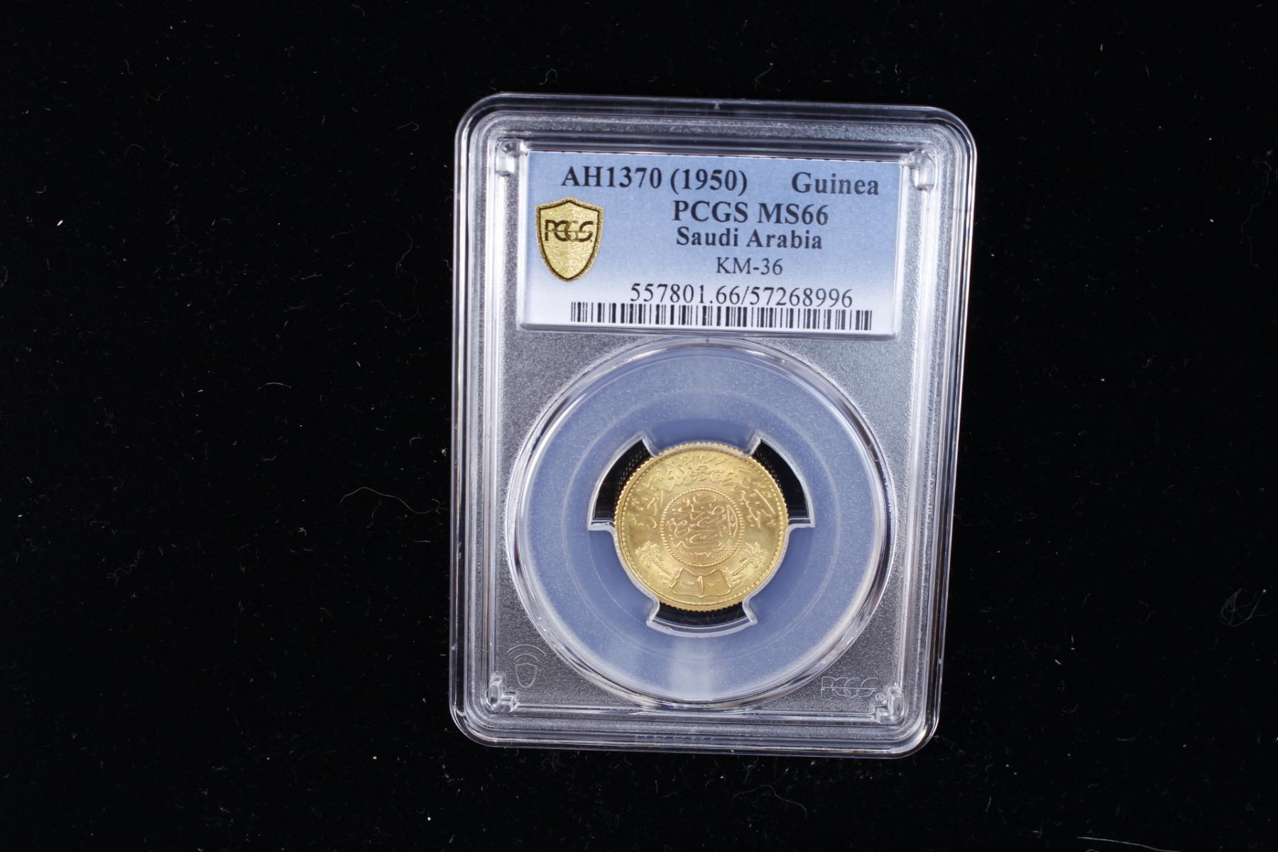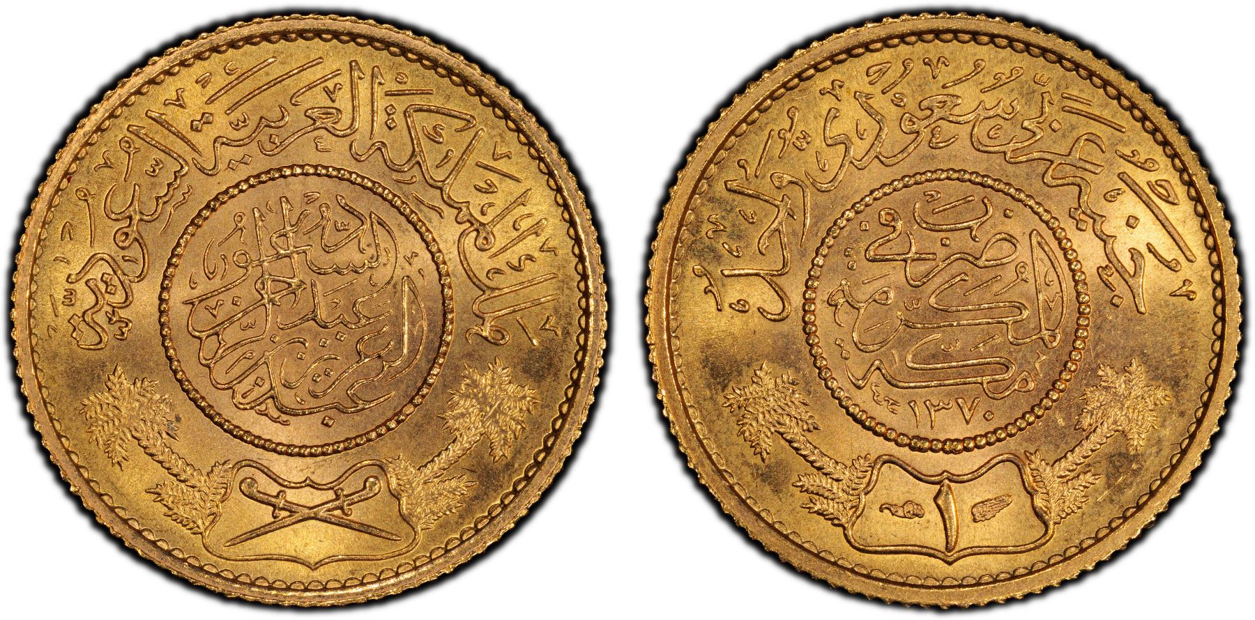 SAUDI ARABIA: 'Abd al-'Aziz b. Sa'ud, 1926-1953, AV guinea, AH1370, KM-36, Makka al-Mukarrama (Mecca), actually struck at the Paris Mint, a fantastic lustrous example! PCGS graded MS66, ex Roma Numismatics Auction 77, Lot 1586.
