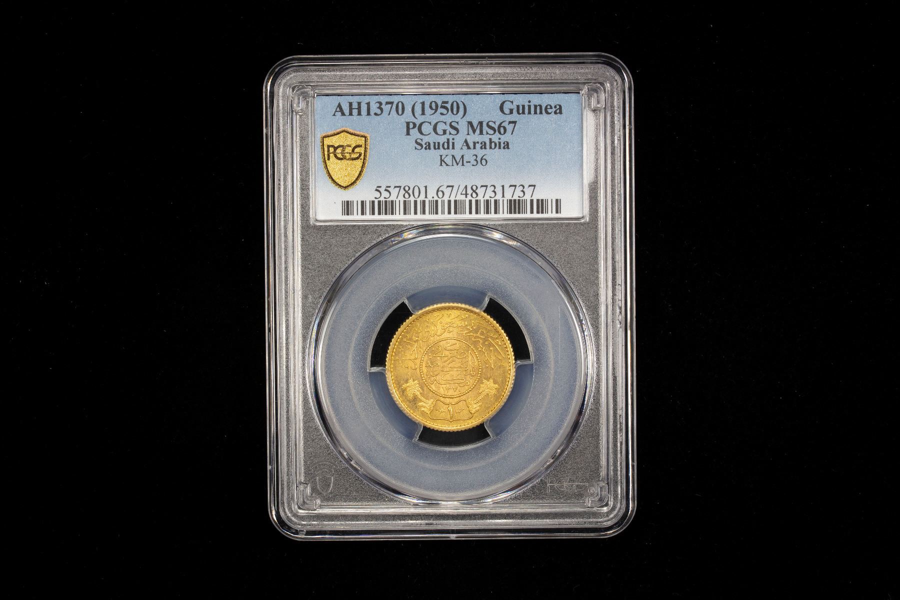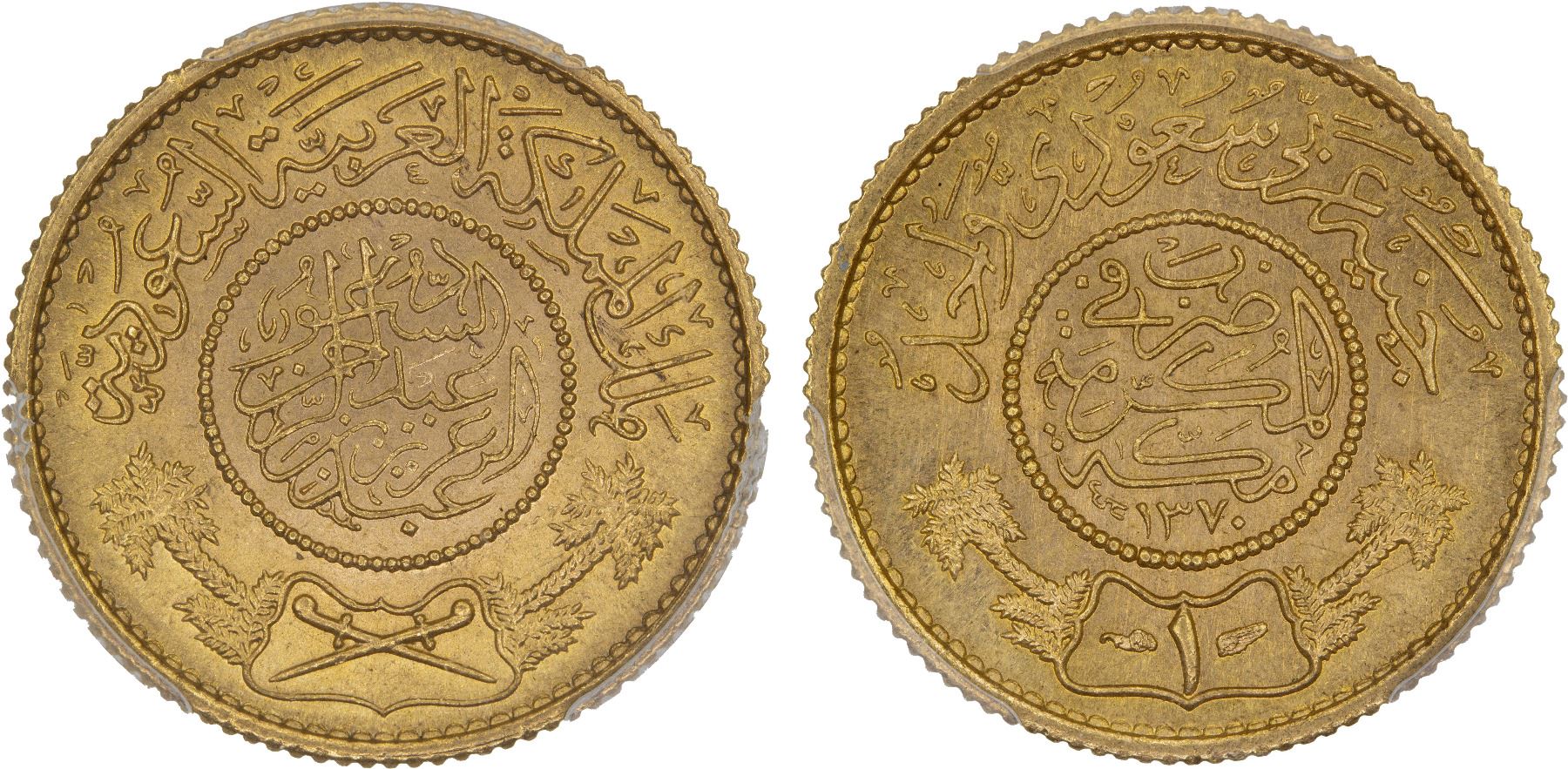SAUDI ARABIA: 'Abd al-'Aziz b. Sa'ud, 1926-1953, AV guinea, AH1370, KM-36, Makka al-Mukarrama (Mecca), actually struck at the Paris mint, PCGS graded MS67