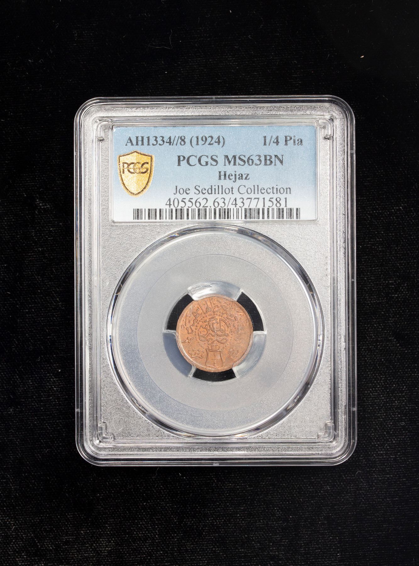 SAUDI ARABIA: HEJAZ: al-Husayn b. 'Ali, 1916-1924, AE ¼ ghirsh, AH1344 year 8, KM-25, Makka al-Mukarrama (Mecca), an attractive mint state example with partial red mint luster, PCGS graded MS63 BN.