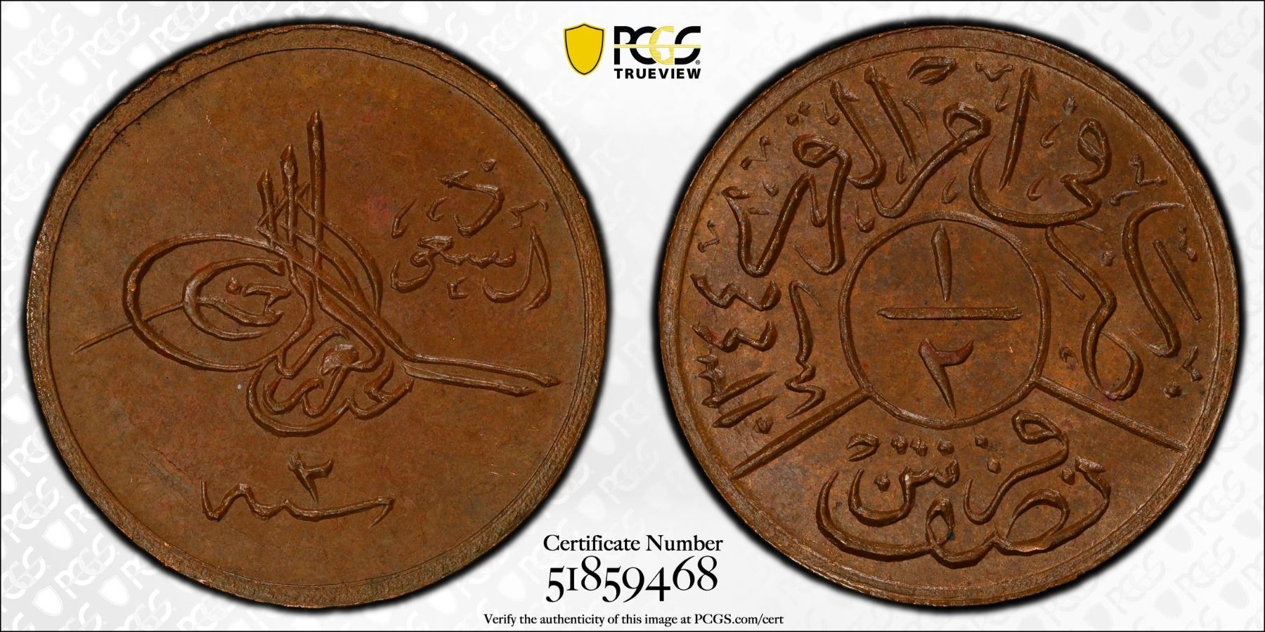 HEJAZ & NEJD: 'Abd al-'Aziz b. Sa'ud, 1924-1926, AE 1/2 ghirsh, Umm al-Qurrâ (Mecca), AH1344 year 2, KM-A3, a superb example, PCGS graded MS65 BN, ex Almer H. Orr III Collection. Occupation issue struck during the Kingdom of Nejd conquest of Hejaz. The city of Mecca fell without struggle on October 13, 1924. Struck in Mecca with the mint epithet as Umm al-Qurrâ (Mother of All Villages).