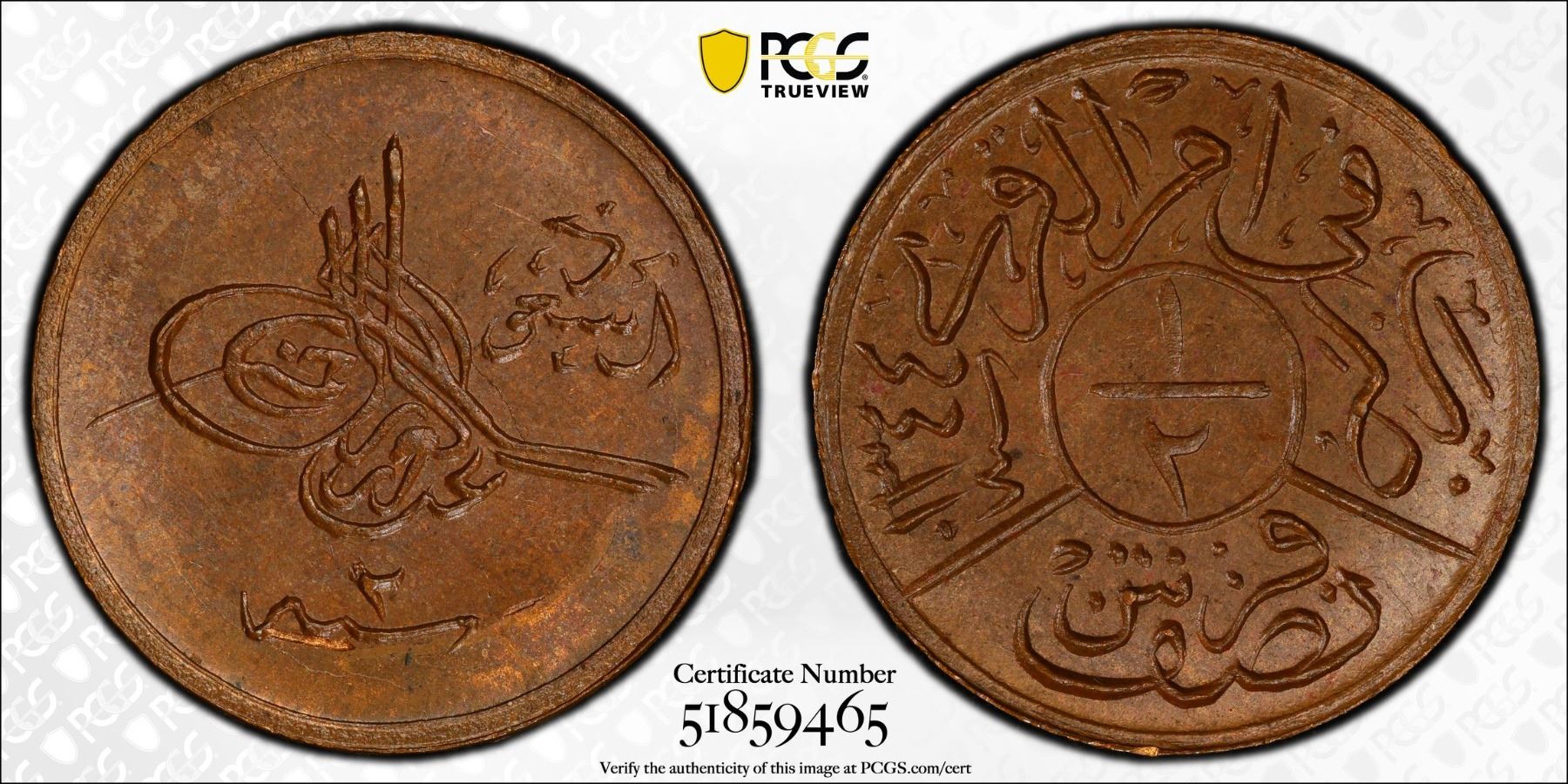 HEJAZ & NEJD: 'Abd al-'Aziz b. Sa'ud, 1924-1926, AE 1/2 ghirsh, Umm al-Qurrâ (Mecca), AH1344 year 2, KM-A3, a wonderful example, PCGS graded MS64 BN, ex Almer H. Orr III Collection. Occupation issue struck during the Kingdom of Nejd conquest of Hejaz. The city of Mecca fell without struggle on October 13, 1924. Struck in Mecca with the mint epithet as Umm al-Qurrâ (Mother of All Villages).
