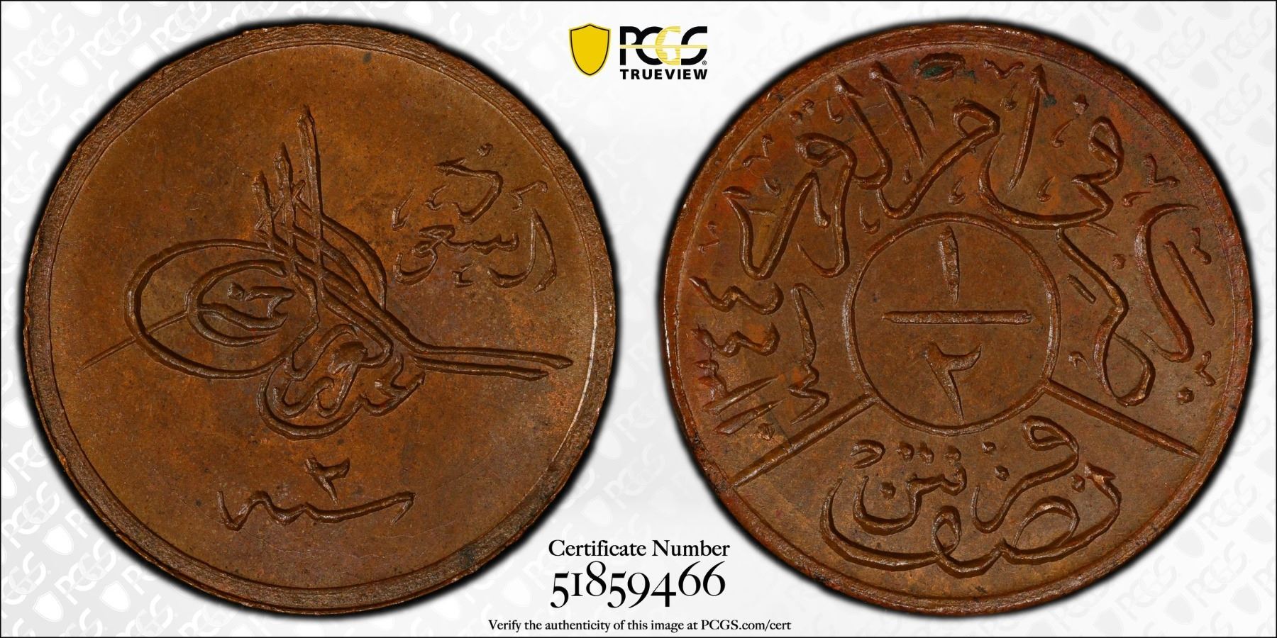 HEJAZ & NEJD: 'Abd al-'Aziz b. Sa'ud, 1924-1926, AE 1/2 ghirsh, Umm al-Qurrâ (Mecca), AH1344 year 2, KM-A3, a wonderful example, PCGS graded MS64 BN, ex Almer H. Orr III Collection. Occupation issue struck during the Kingdom of Nejd conquest of Hejaz. The city of Mecca fell without struggle on October 13, 1924. Struck in Mecca with the mint epithet as Umm al-Qurrâ (Mother of All Villages).