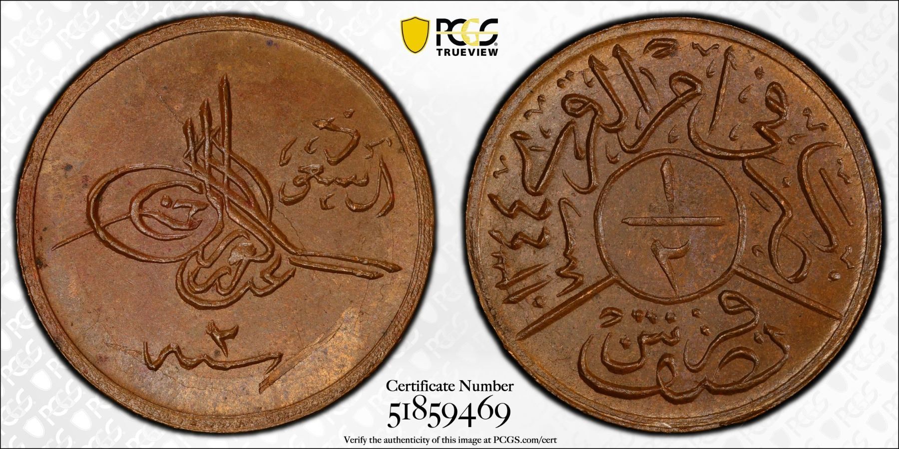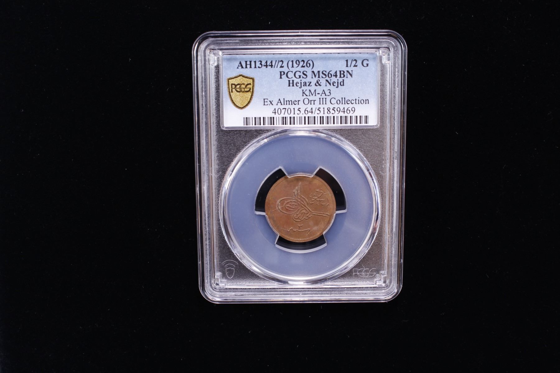 HEJAZ & NEJD: 'Abd al-'Aziz b. Sa'ud, 1924-1926, AE 1/2 ghirsh, Umm al-Qurrâ (Mecca), AH1344 year 2, KM-A3, a wonderful example, PCGS graded MS64 BN, ex Almer H. Orr III Collection. Occupation issue struck during the Kingdom of Nejd conquest of Hejaz. The city of Mecca fell without struggle on October 13, 1924. Struck in Mecca with the mint epithet as Umm al-Qurrâ (Mother of All Villages).