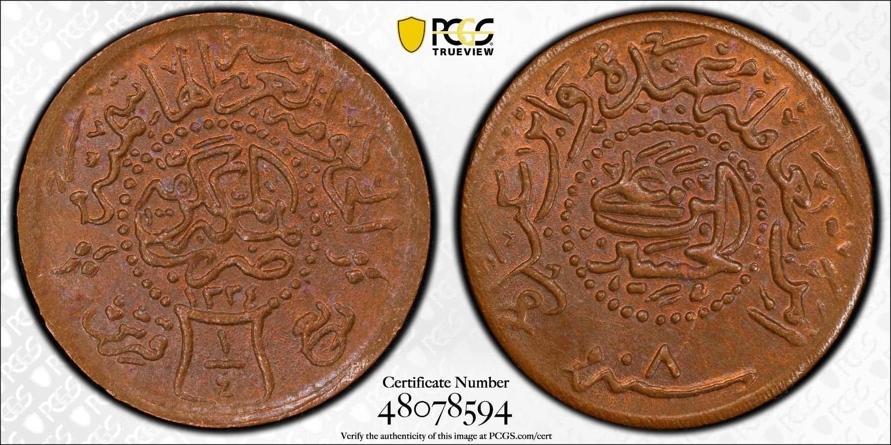 HEJAZ: al-Husayn b. 'Ali, 1916-1924, AE 1/4 ghirsh (1/4 piastre), Makka al-Mukarrama (Mecca), AH1334 year 8, KM-25, traces of red, one-year type, PCGS graded MS64 BN.