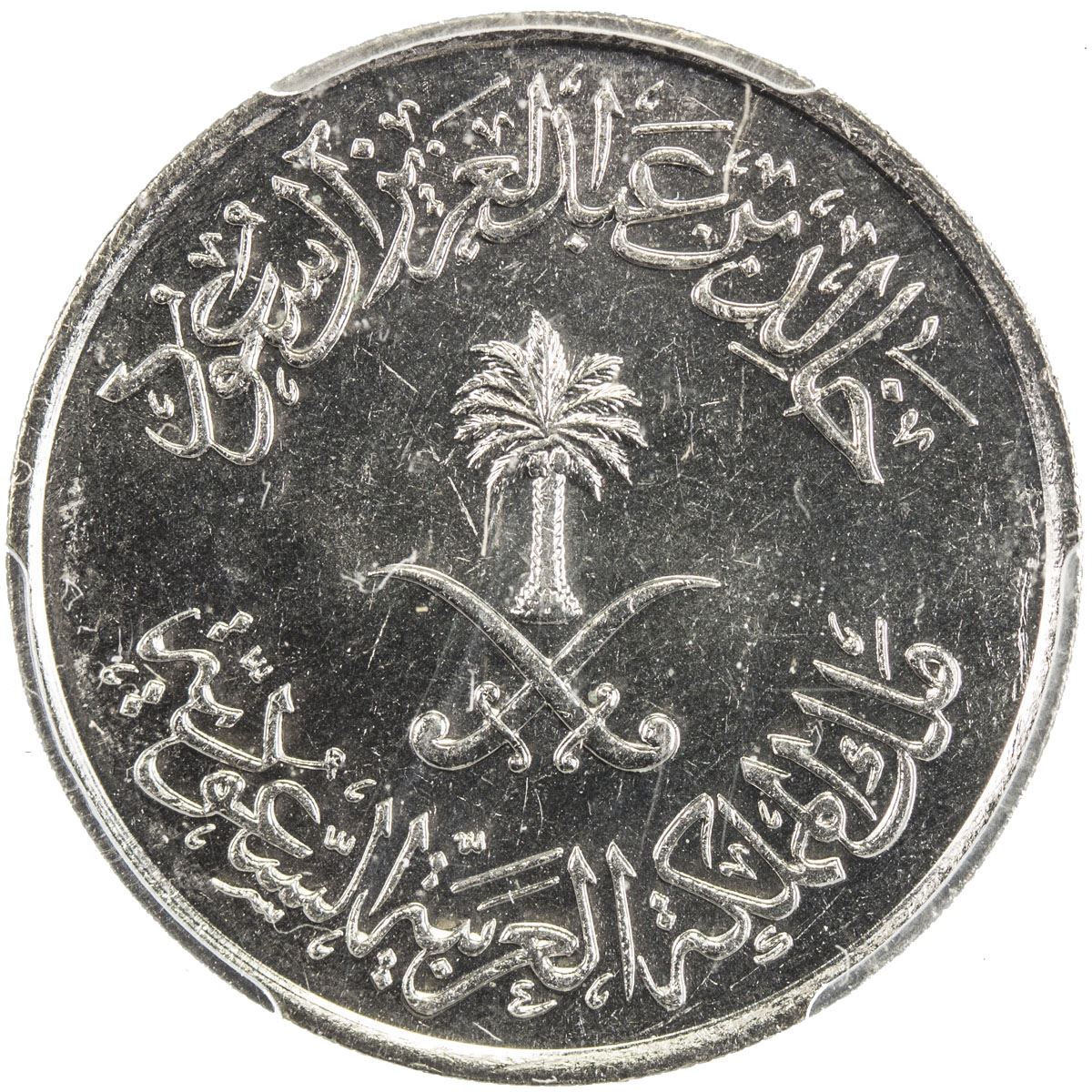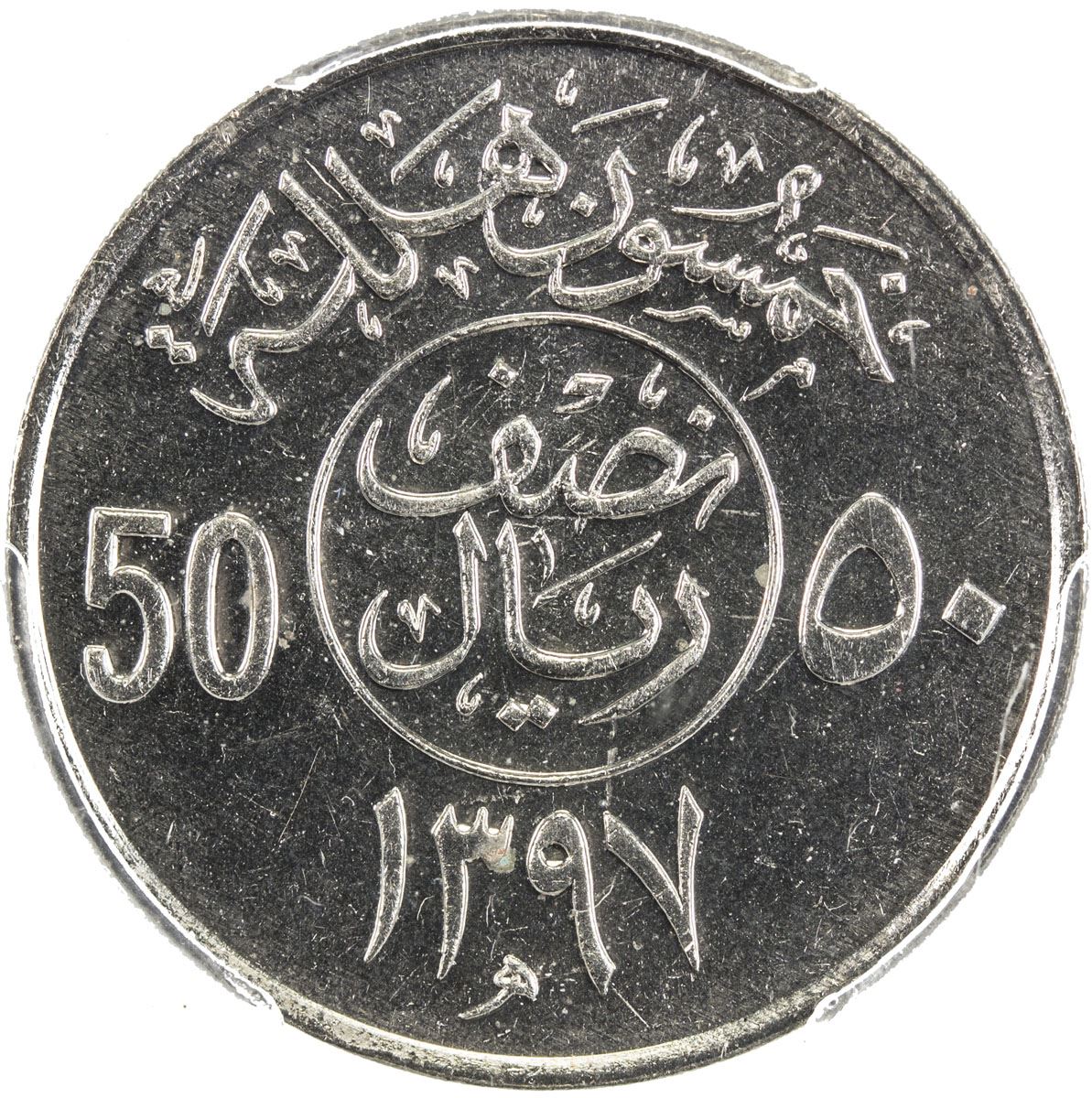 SAUDI ARABIA: Khalid bin Abdulaziz, 1975-1982, 50 halala, AH1397, KM-56, only 2 examples known, PCGS graded Specimen-66, RRR, ex King's Norton Mint Collection.
