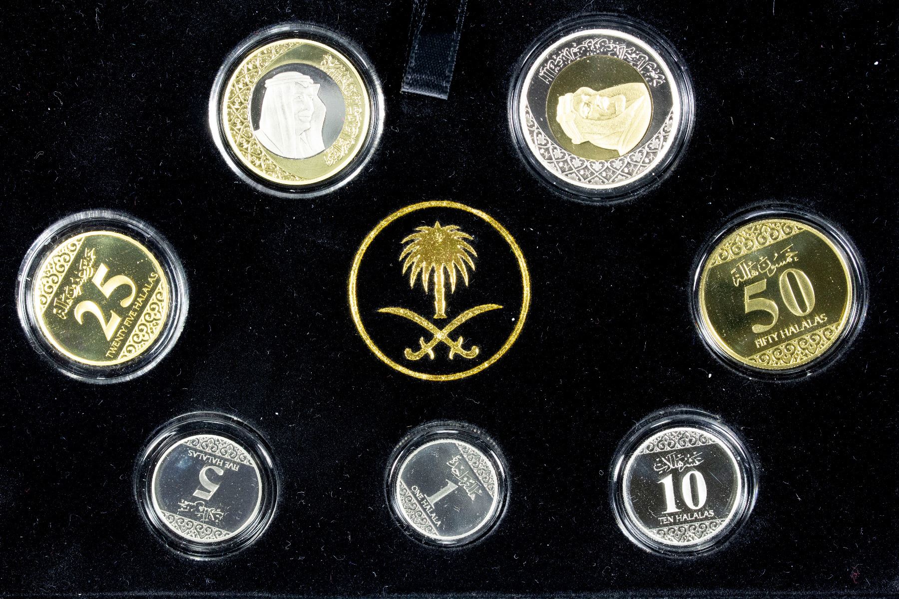 SAUDI ARABIA: Salman bin Abdulaziz, 2015-, 7-coin proof set, 2020/AH1442, all coins dated 2016/AH1438 despite the set being issued in 2020, includes 1, 5, 10, 25, 50 halalas, and bimetallic 1, 2 riyals, plus mint medal, issued by the Saudi Arabian Monetary Authority with COA and all housed in deluxe Monnaie de Paris G20 Riyadh case of issue, set of 8 items.