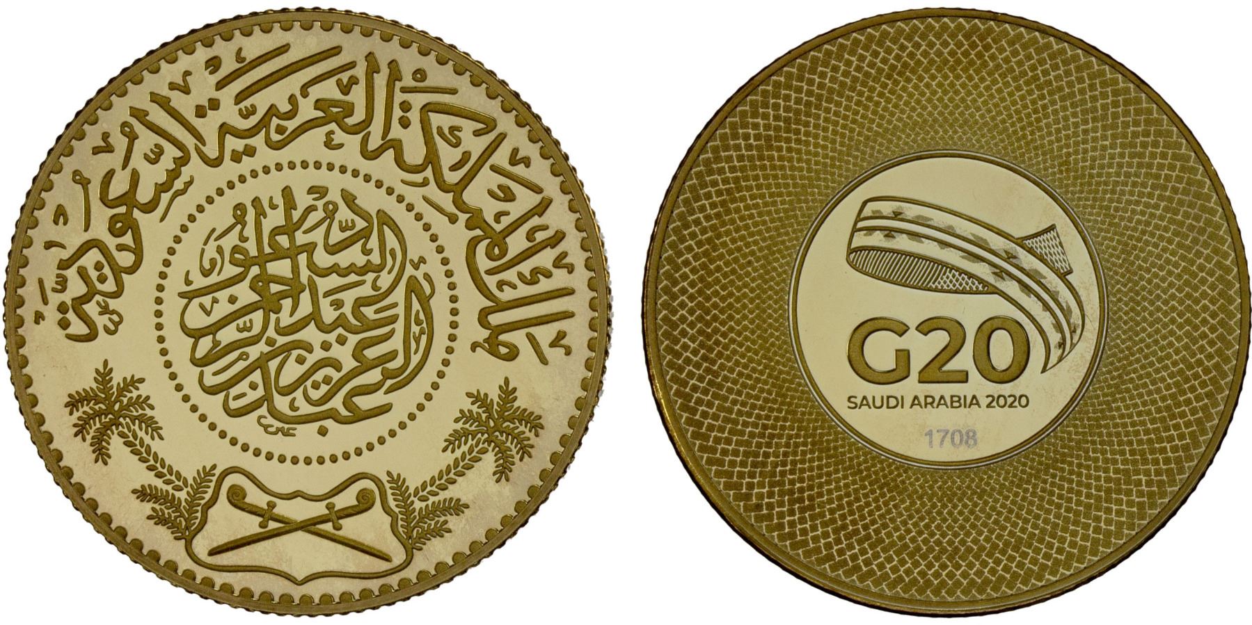 SAUDI ARABIA: gilt AR medal, ND (2020/AH1442), 22mm gilt silver medal for the Saudi Arabian G20 Presidency, numbered 1708 on reverse, with COA and in original case of issue, Proof. The 2020 G20 Riyadh summit was the fifteenth meeting of the Group of Twenty (G20). It was scheduled to take place in Riyadh, the capital city of Saudi Arabia, however, due to the COVID-19 pandemic, it was held virtually.