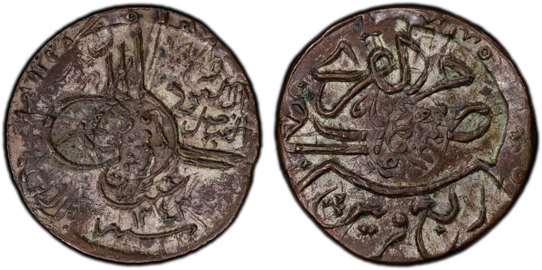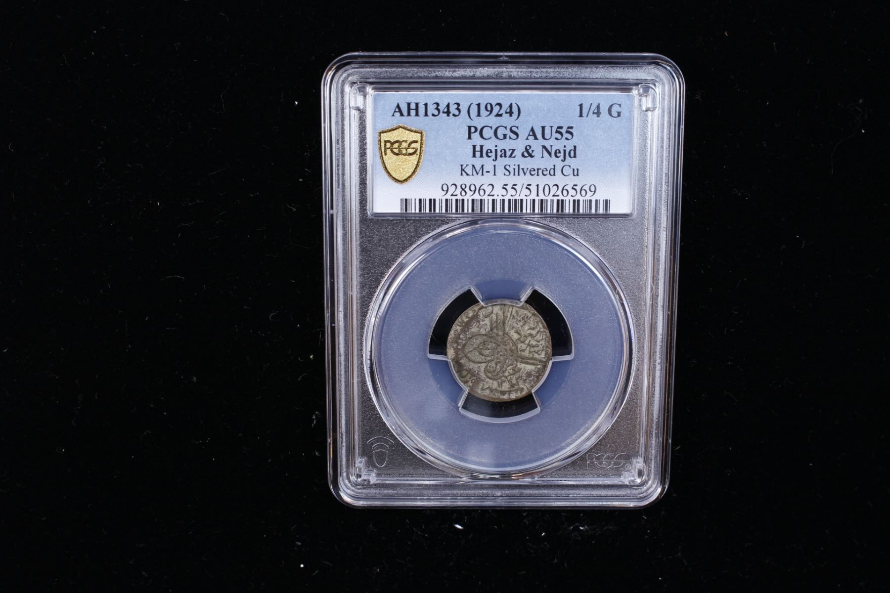 HEJAZ & NEJD: Abd Al-Aziz Bin Sa'ud, 1926-1953, AE 1/4 ghirsh, Umm al-Qurrâ (Mecca), AH1343, KM-1, boldly overstruck on AH1334 year 5 AE 1/2 piastre (KM-23) of Hejaz, and thus very scarce, much original silvering remaining, an attractive nearly mint state example, PCGS graded AU55.