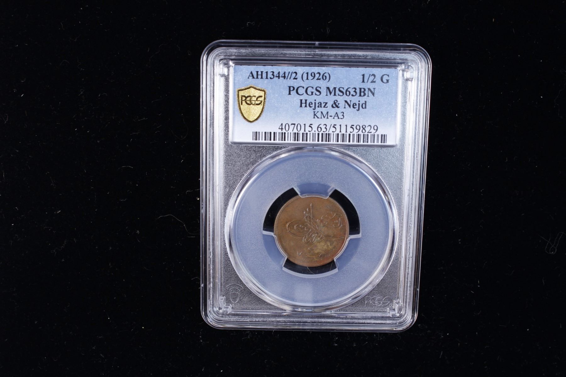 HEJAZ & NEJD: 'Abd al-'Aziz b. Sa'ud, 1924-1926, AE 1/2 ghirsh, AH1344 year 2, KM-A3, a wonderful example, PCGS graded MS63 BN. Occupation issue struck during the Kingdom of Nejd conquest of Hejaz. The city of Mecca fell without struggle on October 13, 1924. Struck in Mecca with the mint epithet as Umm al-Qurrâ (Mother of All Villages).
