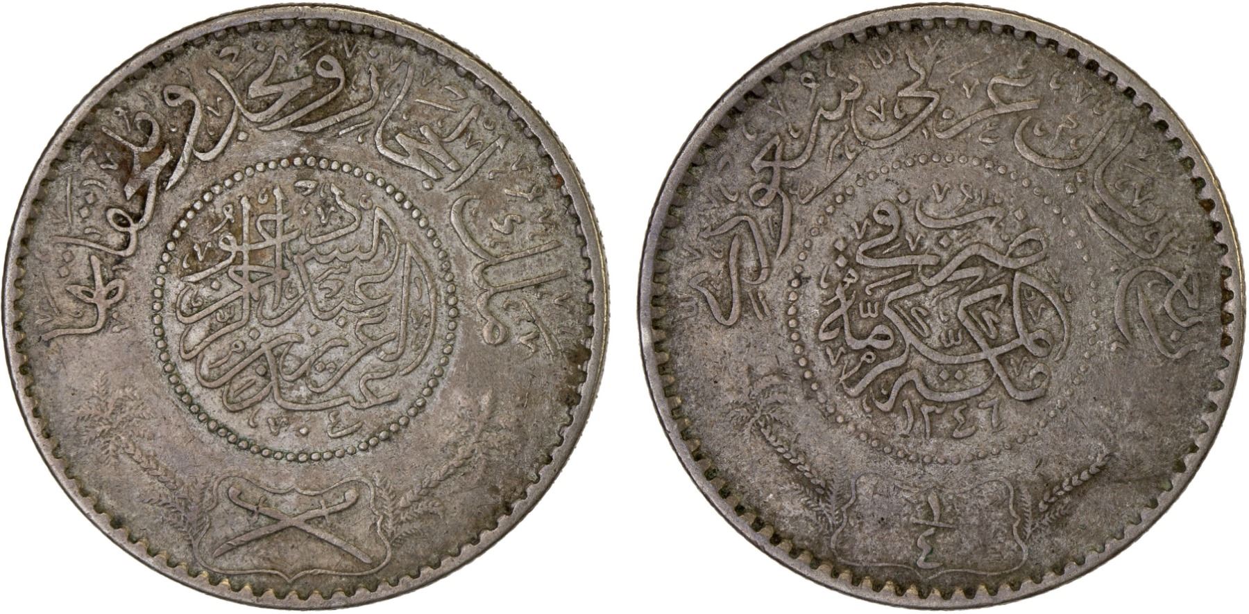 SAUDI: HEJAZ & NEJD: Abd al-Aziz b. Sa'ud, 1926-1953, AR 1/4 riyal, Makka al-Mukarrama (Mecca), AH13