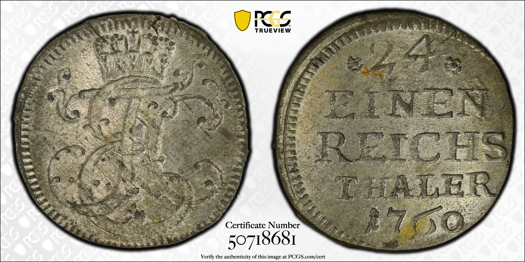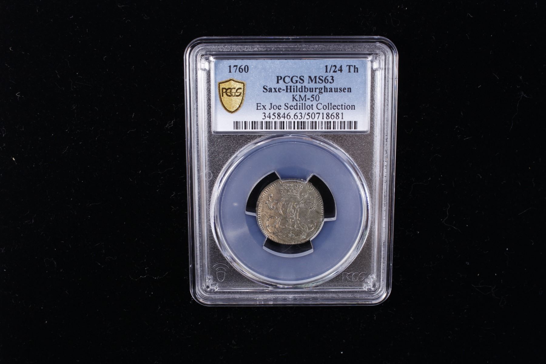 SAXE-HILDBURGHAUSEN: Ernst Friedrich III, 1745-1780, BI 1/24 thaler, 1760, KM-50, Cr-29, a lovely lustrous mint state example! PCGS graded MS63, ex Joe Sedillot Collection. In 1760, Saxe-Hildburghausen was suffering from deep debt and economic decline under Duke Ernst Frederich III, while also feeling the indirect strain of the Seven Years’ War. The duchy was under imperial financial oversight and had little autonomy.