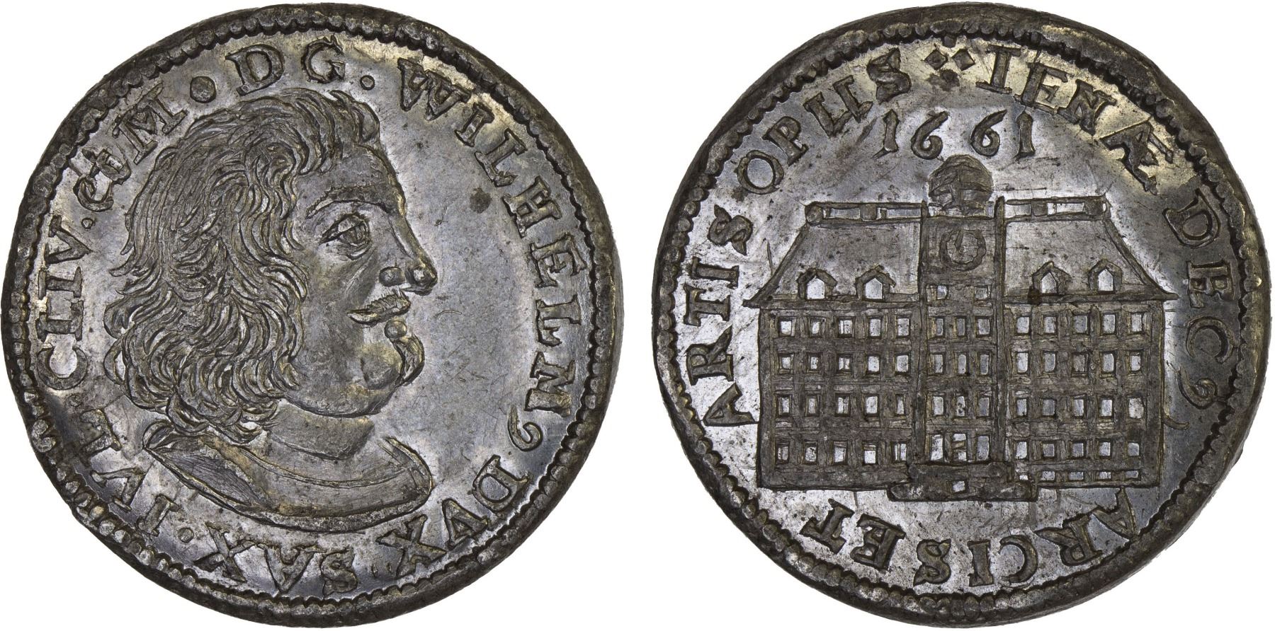 SAXE-NEW WEIMAR: Wilhelm, 1641-1662, white metal medal, 1661, Koppe-353, Merseburger-3883, 22mm white medal metal for the construction of a large globe on the castle in Jena; D.G. WILHELM DUX SAX. IVL. CLIV. CTM. around bust of Duke right // IENAE DEC9 ARCIS ET ARTIS OPUS (The ornament of Jena is a work of fortress and art) and date around castle of Jena with globe on the roof, PCGS graded AU. Koppe refers to Röblitz, who held the opinion that fewer than 100 in silver of this memorial piece have been minted, which explains the extraordinary rarity. Under the mathematician and astronomer Erhard Weigel, the Duke had a large sky globe built on the castle, a precursor of modern planetariums.