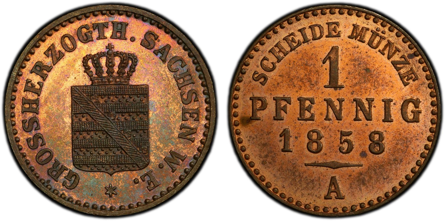 SAXE-WEIMAR-EISENACH: Karl Alexander, 1853-1901, AE pfennig, 1858-A, PCGS Proof 64 RB