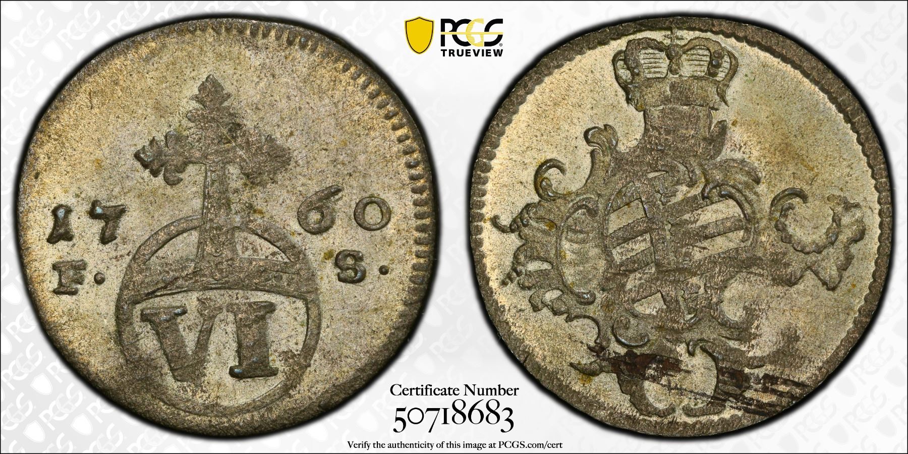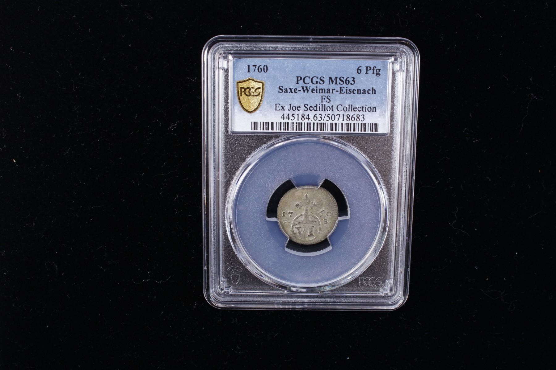 SAXE-WEIMAR-EISENACH: Karl August, 1758-1815, BI 6 pfennig, 1760, KM-109.1, Cr-38, mintmaster initials FS, a lovely lustrous mint state example! PCGS graded MS63, ex Joe Sedillot Collection. In 1760, Saxe-Weimar-Eisenach was under regency rule by Duchess Anna Amalia for her young son Karl August during the Seven Years' War. Though impacted by the war’s pressures, the duchy stayed mostly peaceful and began developing the intellectual and cultural environment that would later define Weimar’s golden age.