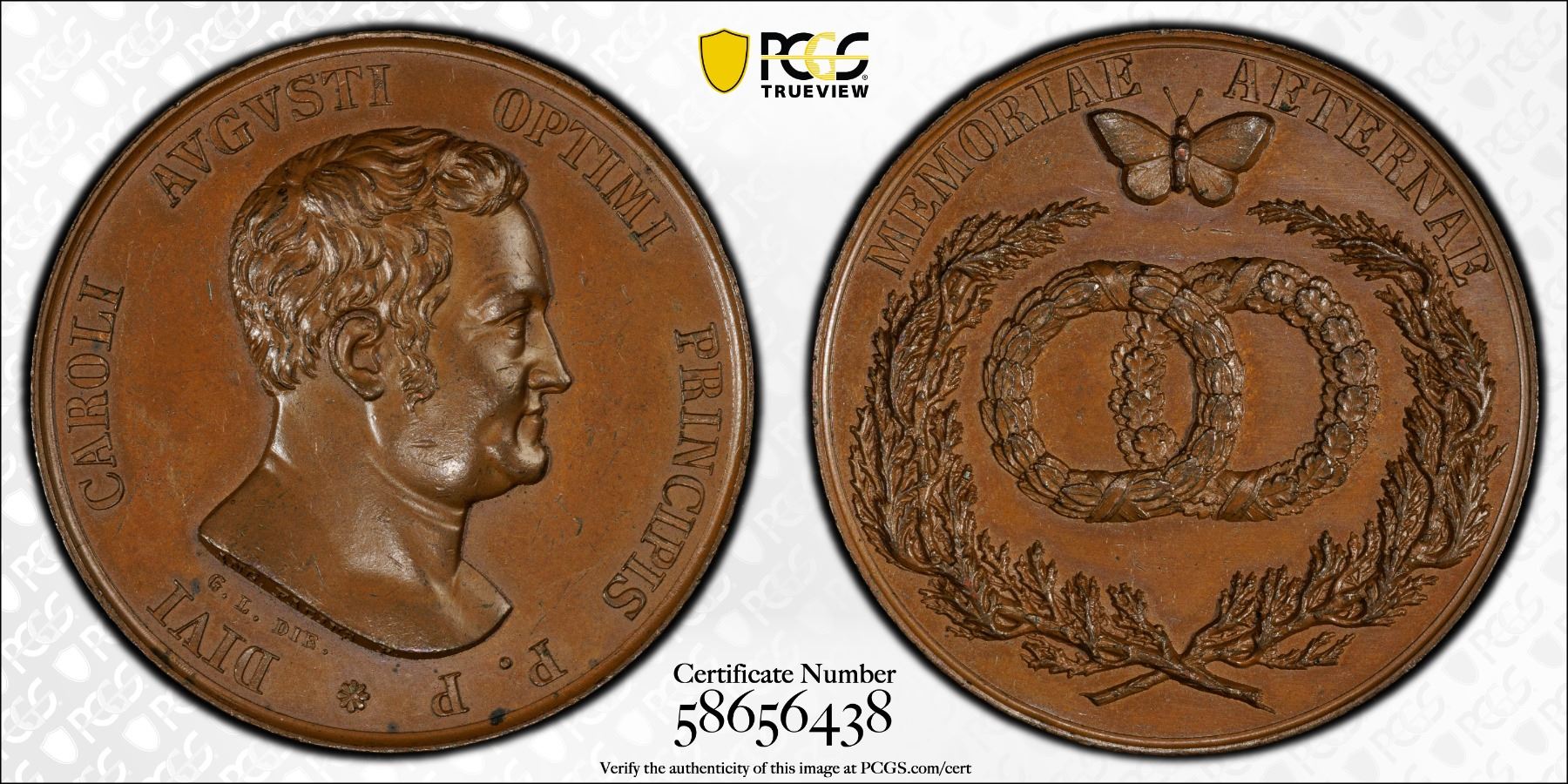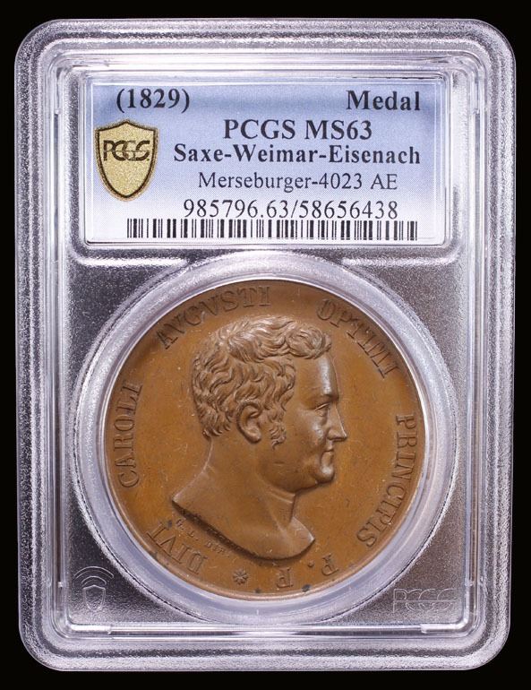 SAXE-WEIMAR-EISENACH: Karl Friedrich, 1828-1853, AE medal (39.62g), ND (1829), Frede-32, Goethe-1403, Merseburger-4023, 42mm bronze medal by Angelica Facius and Gottfried Loos for the Death of Karl August; CAROLI AVGUSTI OPTIMI PRINCIPIS around bust right of former Grand Duke // MEMORIAE AETERNAE and butterfly above intertwined laurel and oak wreaths between cypress branches, a lovely mint state example! PCGS graded MS63. Karl August, was grand duke of Saxe-Weimar-Eisenach from 1815 until his death. He is noted for the intellectual brilliance of his court. Angelica Bellonata Facius (1806-1887) was a female German sculptor, gem engraver, and medallist. She was influenced by the intellectual circles around Goethe and initially studied art with Christian Daniel Rauch in Berlin. Her unusual talents brought her the support of many in the artistic community, including the famous medalist, Gottfried Bernhard Loos, as well as Goethe himself. In Berlin from 1827 to 1834, she was under apprenticeship with Rauch. While there, she lodged with the family of Goethe's friend, the composer, Carl Friedrich Zelter, who kept Goethe informed of her progress.