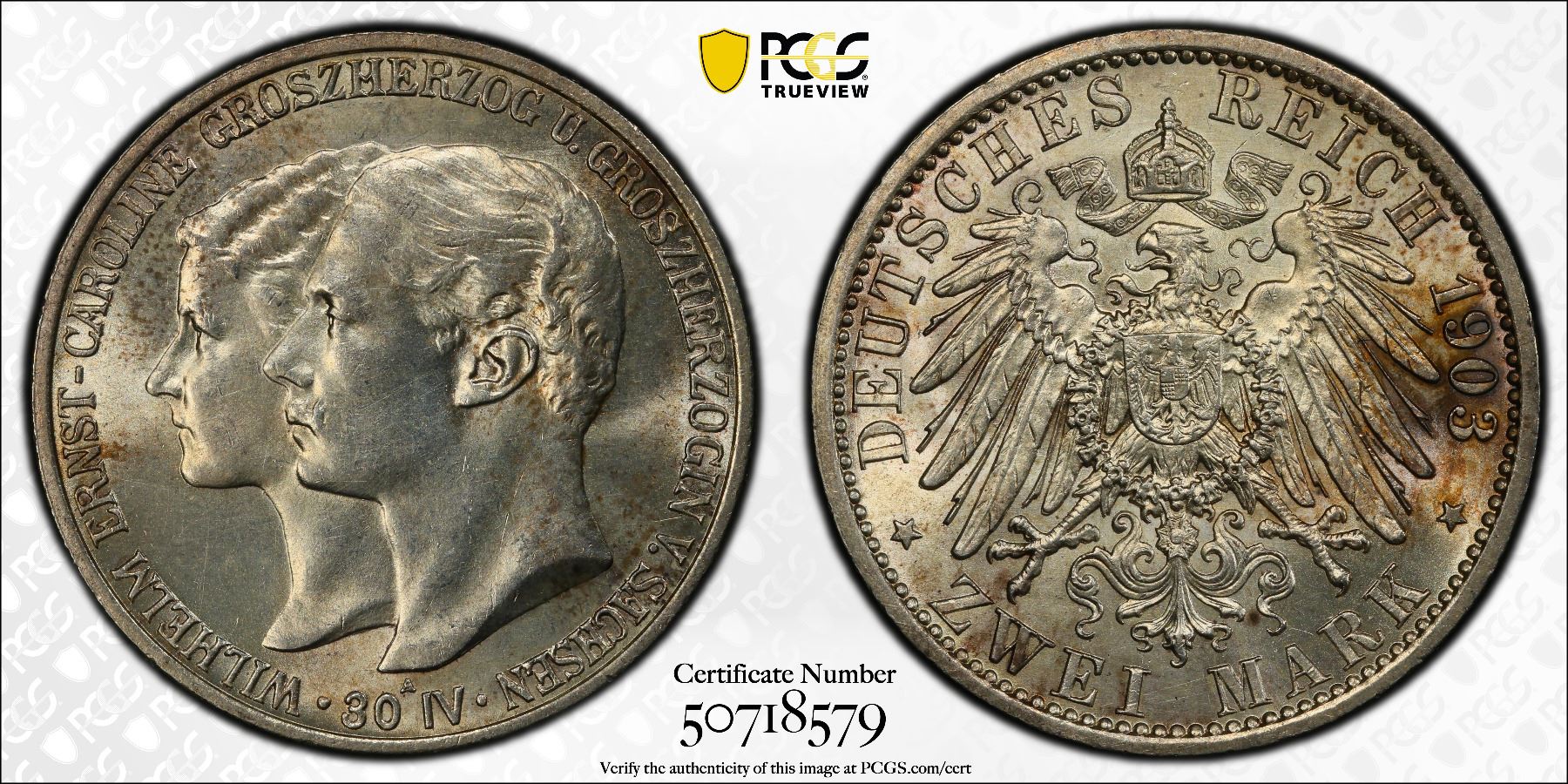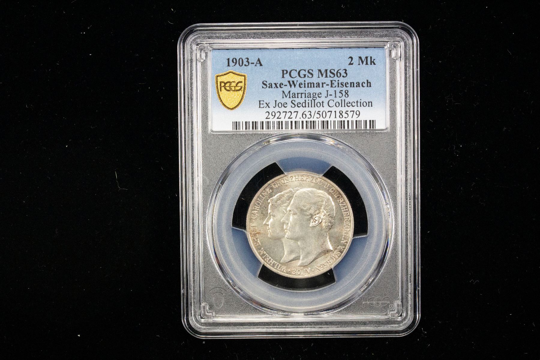 SAXE-WEIMAR-EISENACH: Wilhelm Ernst, 1901-1918, AR 2 mark, 1903-A, KM-217, Y-172, J-158, Commemorating the Grand Duke's First Marriage to Caroline, medallic alignment, a lovely lustrous mint state example! PCGS graded MS63, ex Joe Sedillot Collection. In Bückeburg on 30 April 1903 Wilhelm Ernst married Princess Caroline Reuss of Greiz, a daughter of Prince Heinrich XXII Reuss of Greiz. The marriage was childless and ended in 1905 with the death of Caroline under mysterious circumstances.