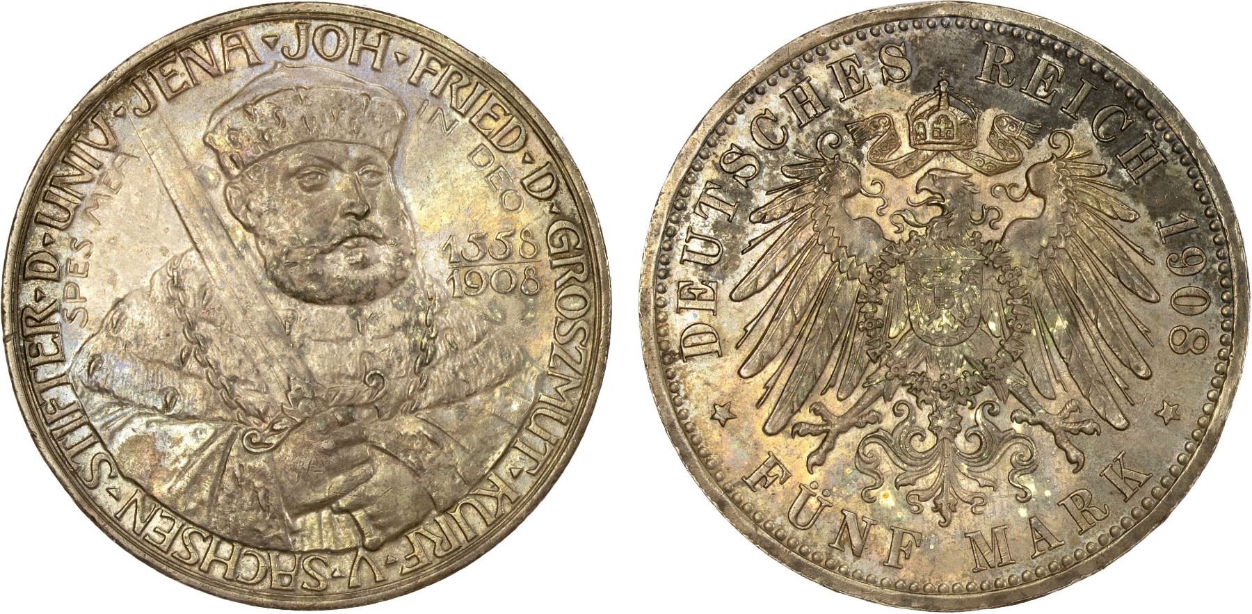 SAXE-WEIMAR-EISENACH: Wilhelm Ernst, 1901-1918, AR 5 mark, 1908-A, KM-220, J-161, 350th Anniversary of Jena University, Kurfürst Johann Friedrich in ceremonial garments holding sword, EF to About Unc.