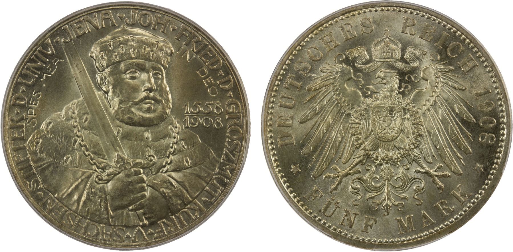 SAXE-WEIMAR-EISENACH: Wilhelm Ernst, 1901-1918, AR 5 mark, 1908, KM-220, Y-175, Jaeger-161, Jena University 350th Anniversary, blast white luster, a lovely example! PCGS graded MS66+.