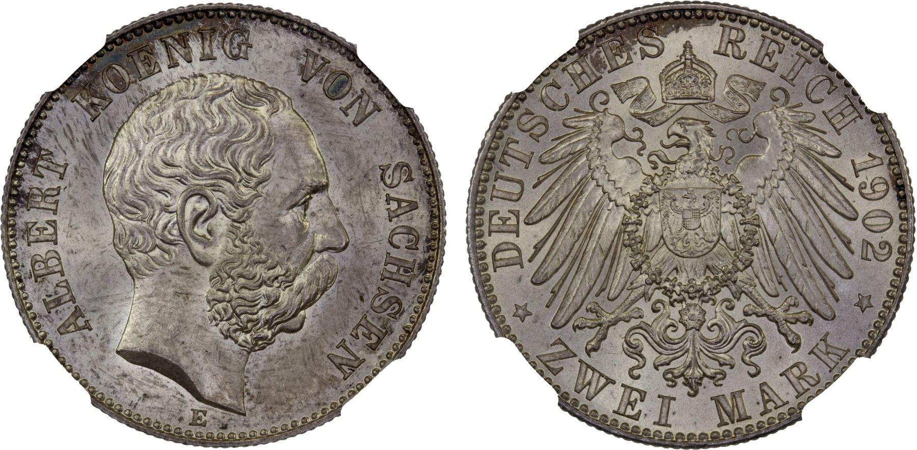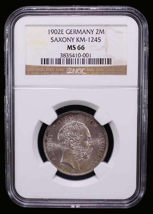 SAXONY: Albert, 1873-1902, AR 2 mark, Muldenhutten, 1902-E, KM-1245, Jaeger-124, lustrous under light tone, a lovely example! NGC graded MS66.