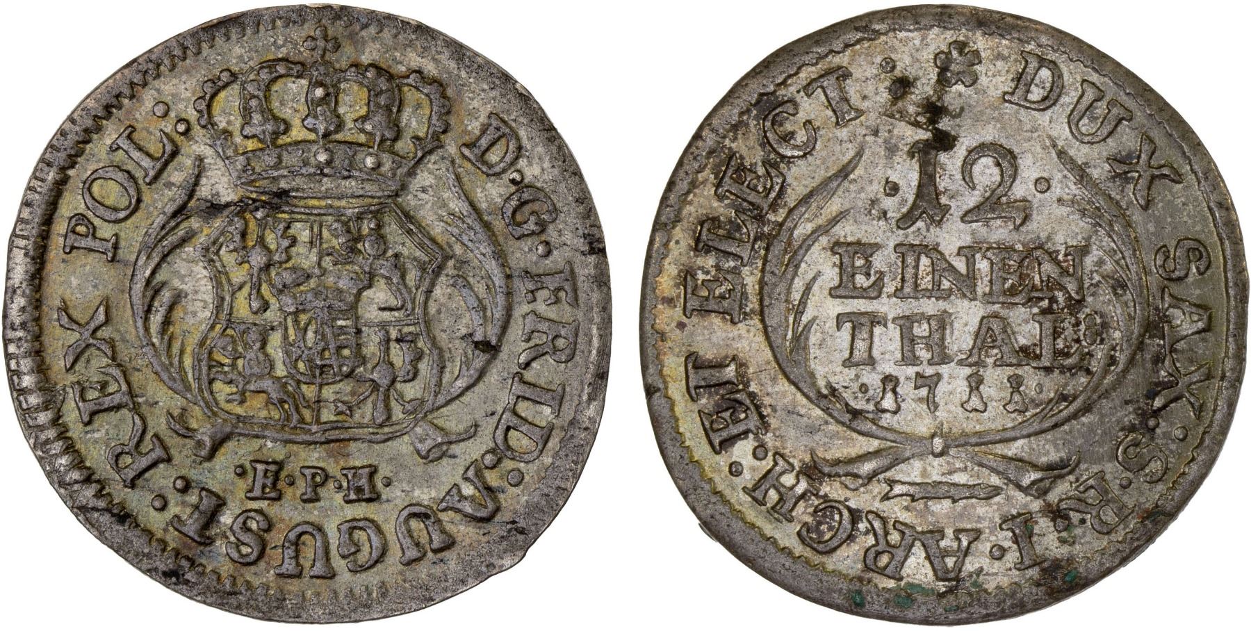 SAXONY: Friedrich August I, 1694-1733, AE 1/12 thaler, Leipzig, 1711, KM-746, EPH mintmaster initials, with Polish and Lithuanian arms, Choice AU.