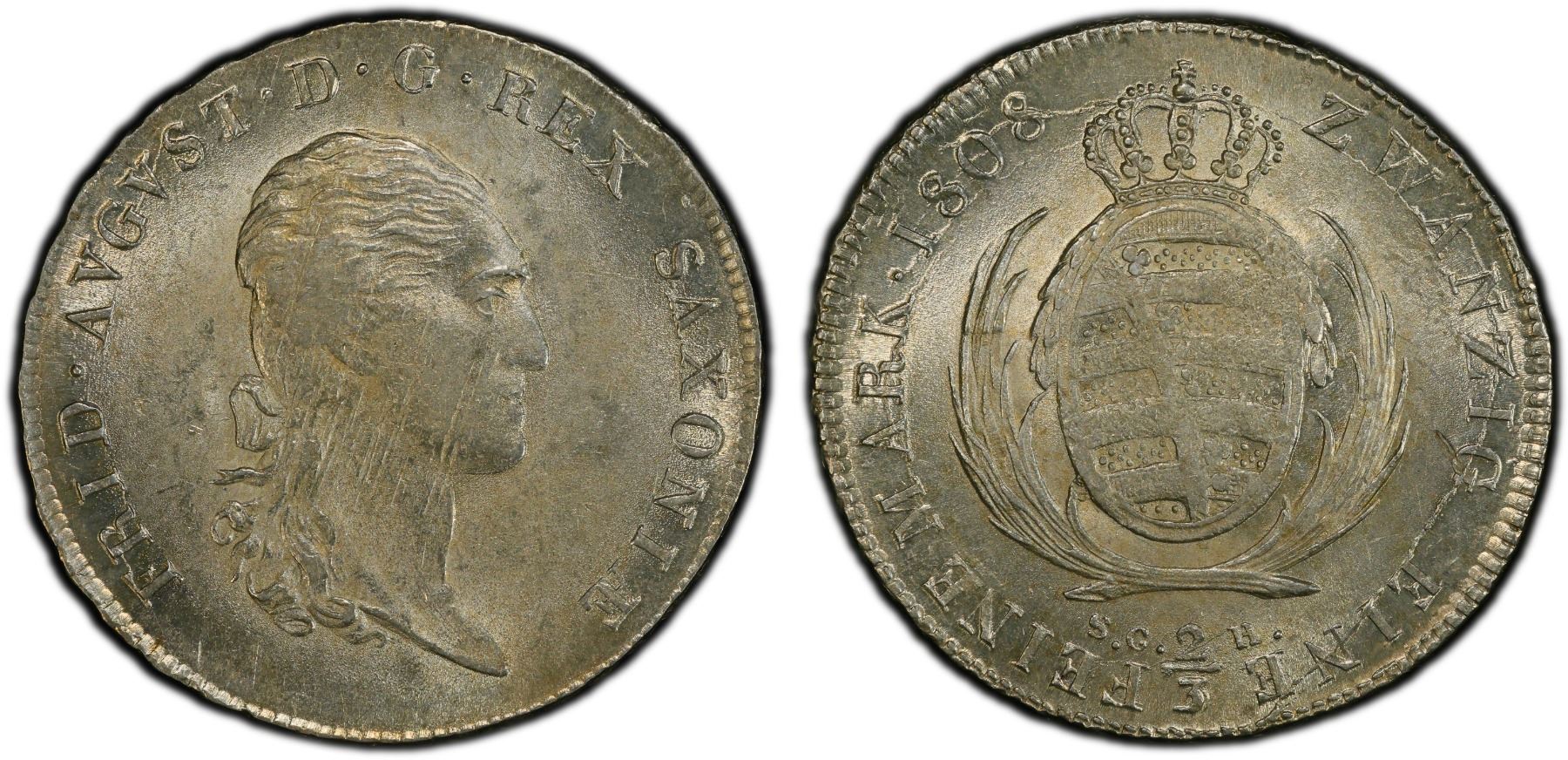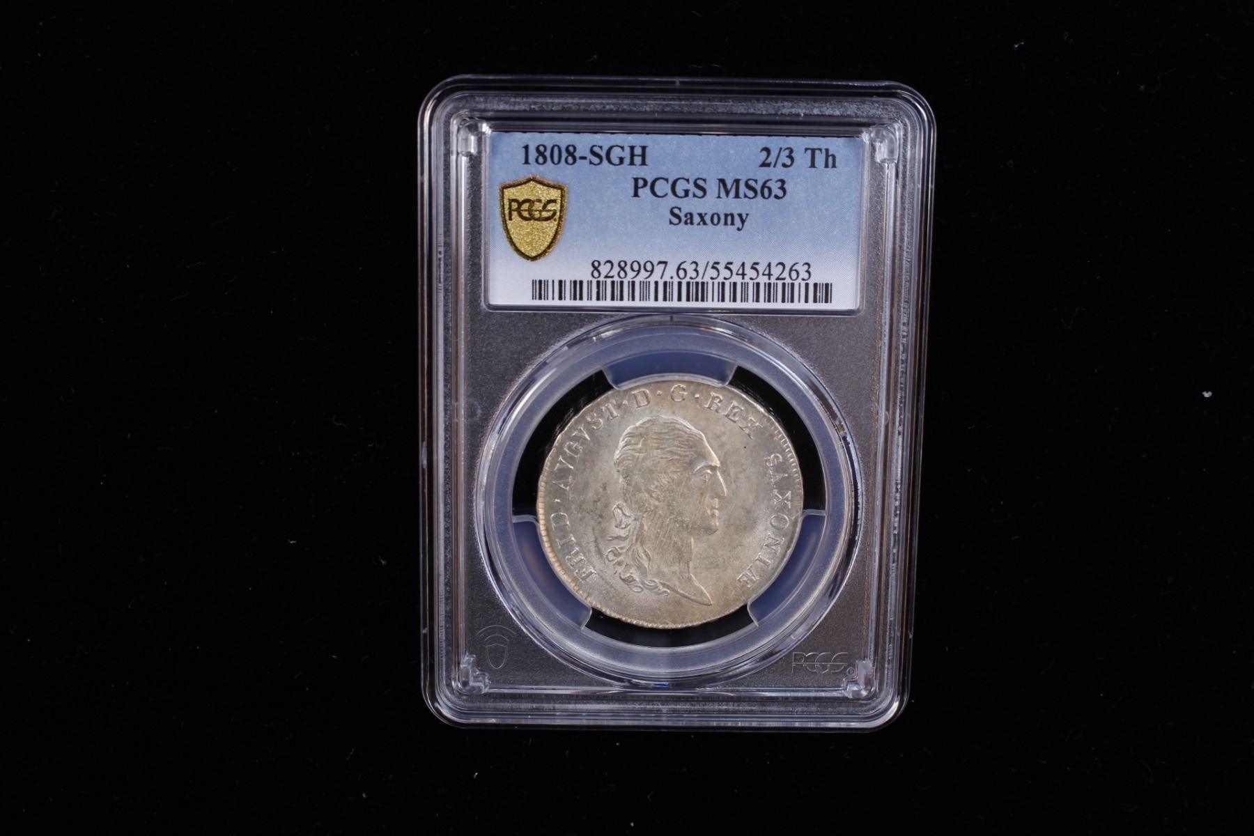SAXONY: Friedrich August I, 1806-1827, AR 2/3 thaler, 1808, KM-1052, Cr-177, mintmaster initials SGH, a lovely mint state example! PCGS graded MS63.