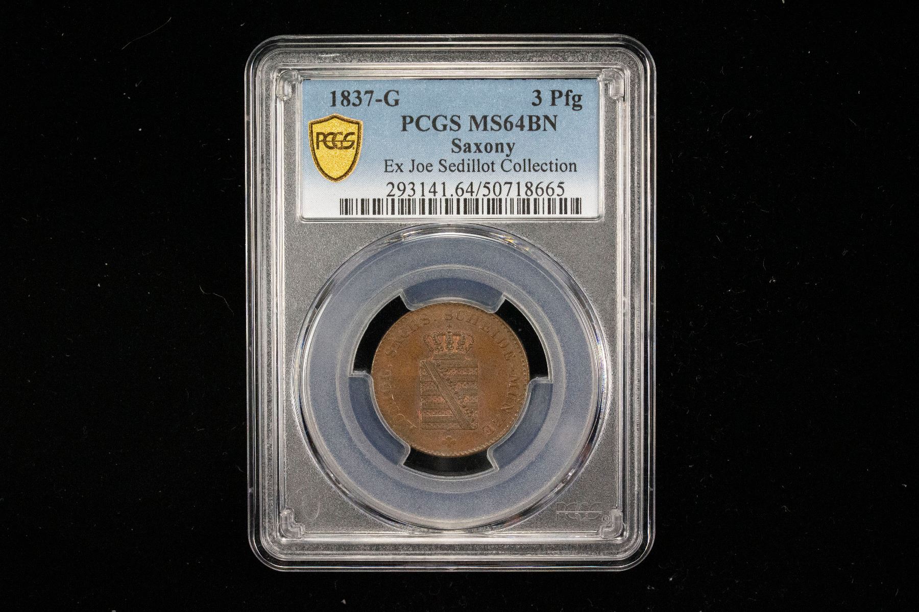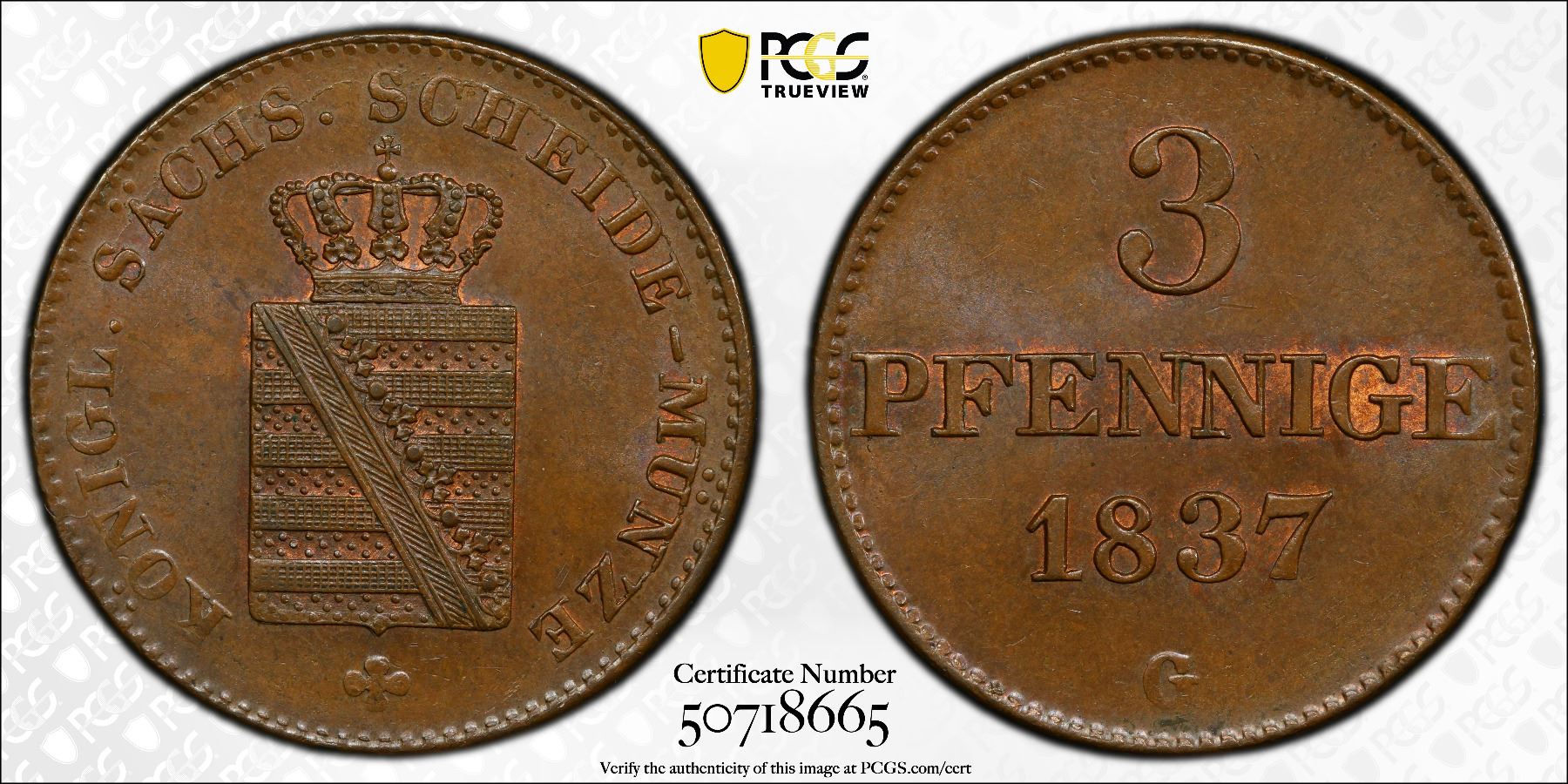 SAXONY: Friedrich August II, 1836-1854, AE 3 pfennig, 1837-G, PCGS MS64 BN