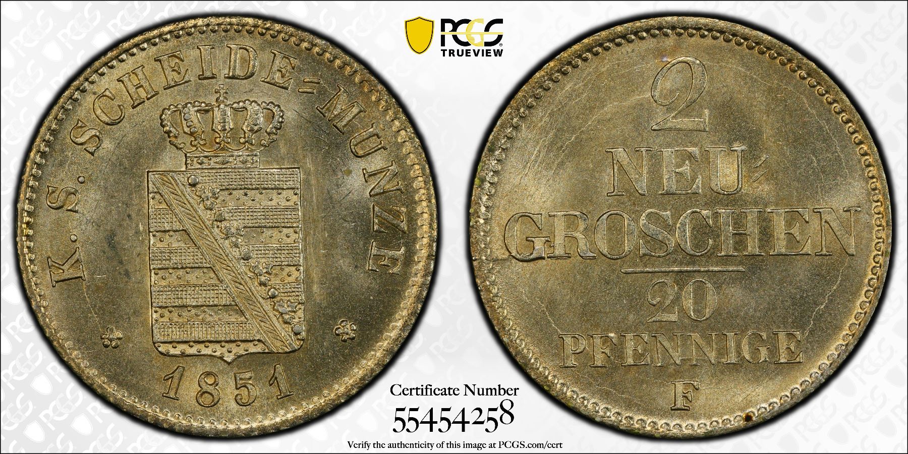 SAXONY: Friedrich August II, 1836-1854, AR 2 groschen, 1851, KM-1160, mint master initial F, a wonderful mint state example! PCGS graded MS64.