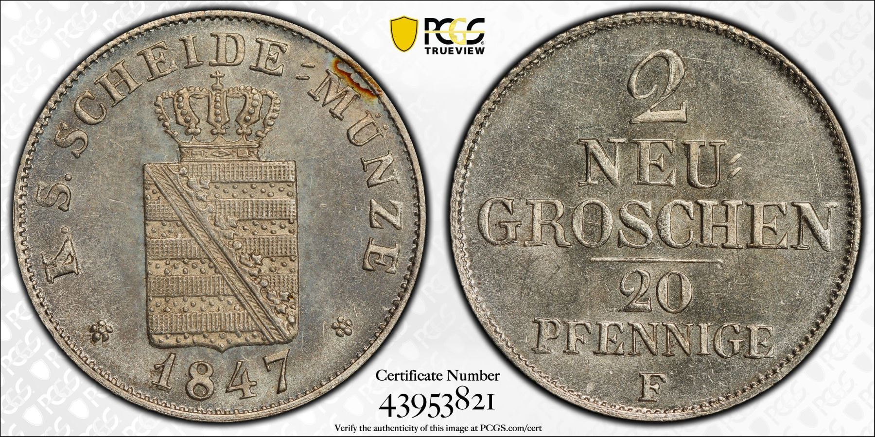 SAXONY: Friedrich August II, 1836-1854, AR 2 groschen (20 pfennig), 1847-F, PCGS MS65