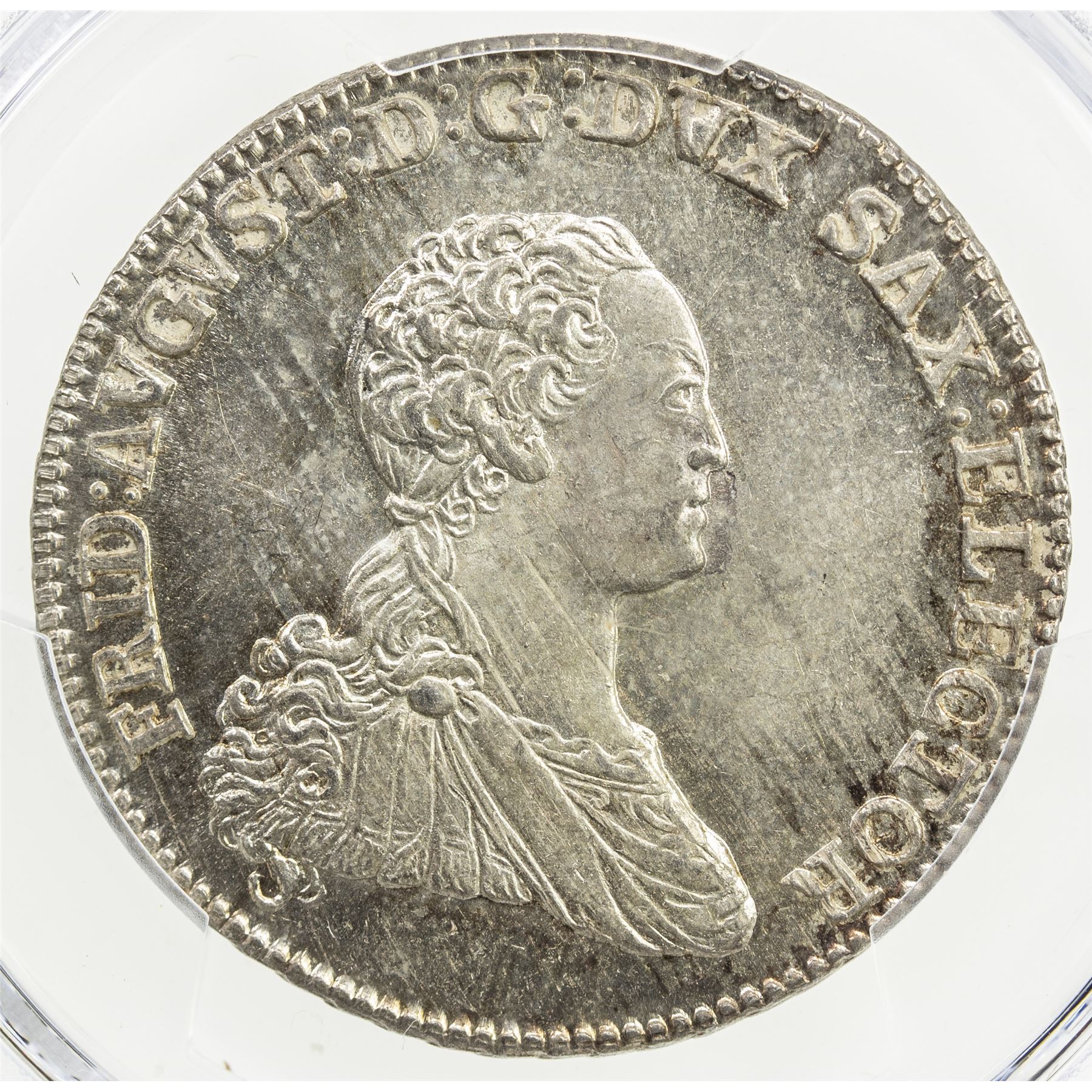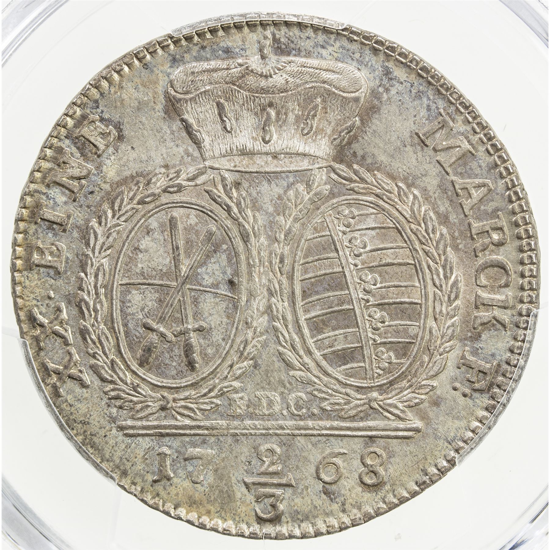 SAXONY: Friedrich August III, 1763-1806, AR 2/3 thaler, 1768, KM-981, mintmaster initials EDC, a fantastic quality example with lovely reverse toning! PCGS graded MS64.
