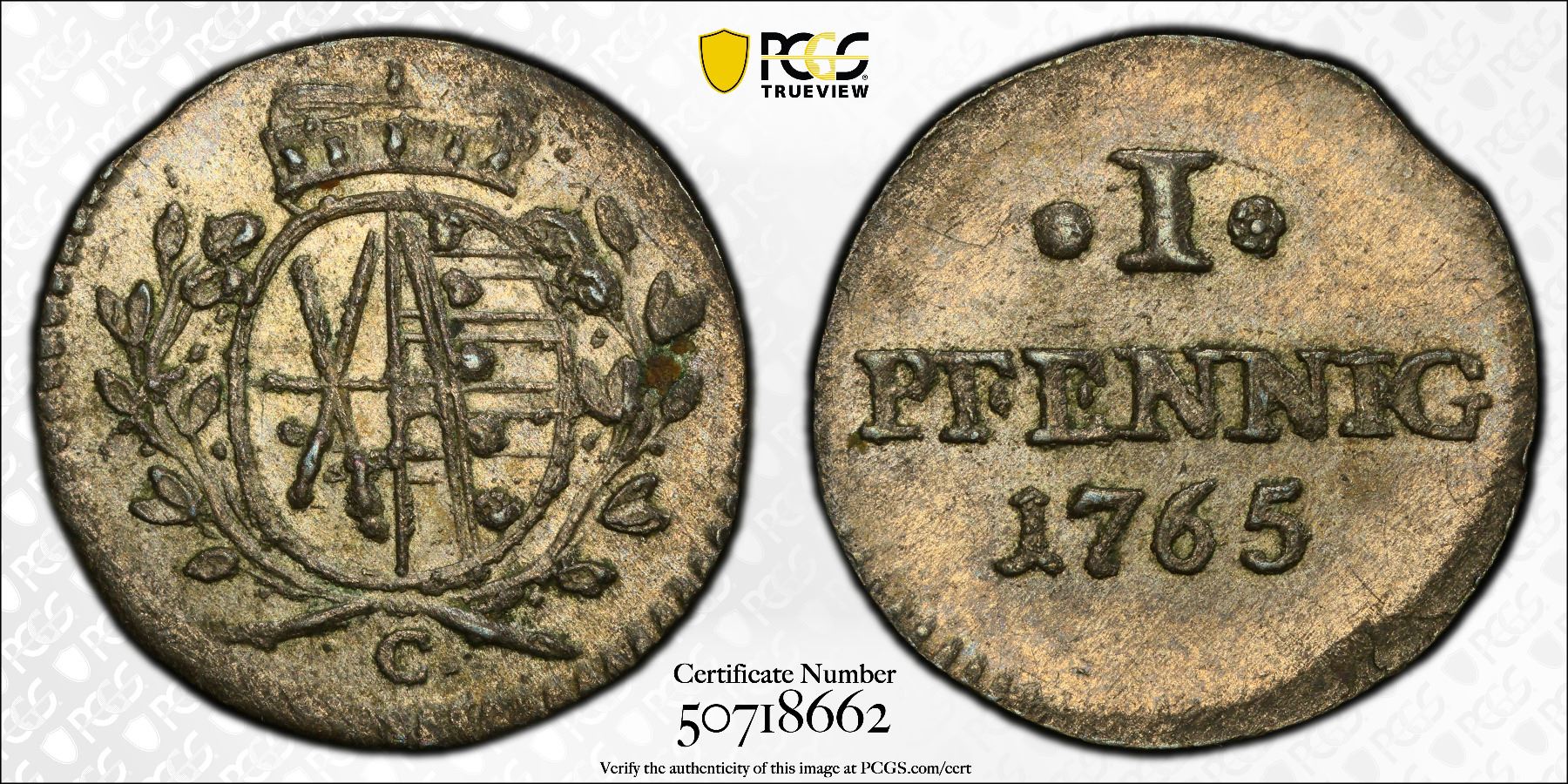 SAXONY: Friedrich August III, 1763-1806, BI pfennig, 1765-C, PCGS MS63